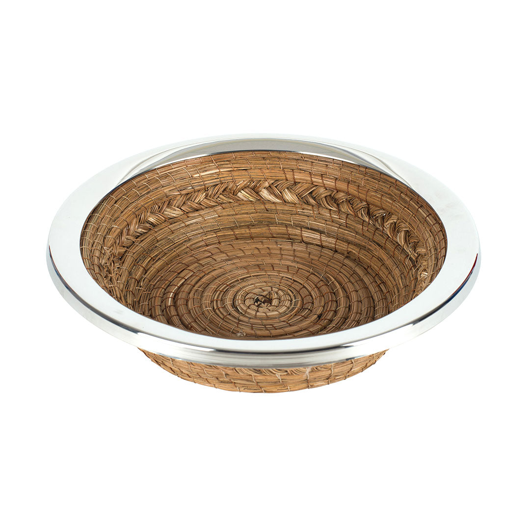 This small round angled braided basket is handmade by artisans using woven, fallen pine needles and non-tarnish nickel trim. Each basket is unique and no two are the same.