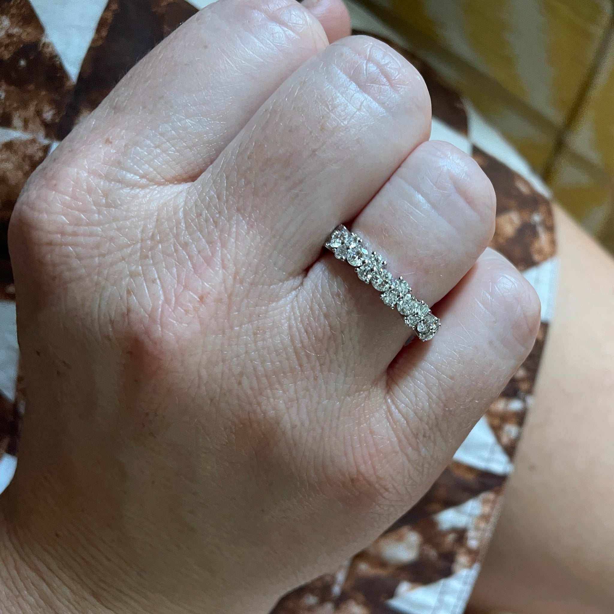 This halfway band features alternating single and double round brilliant diamonds secured by shared prongs in 14K white gold.