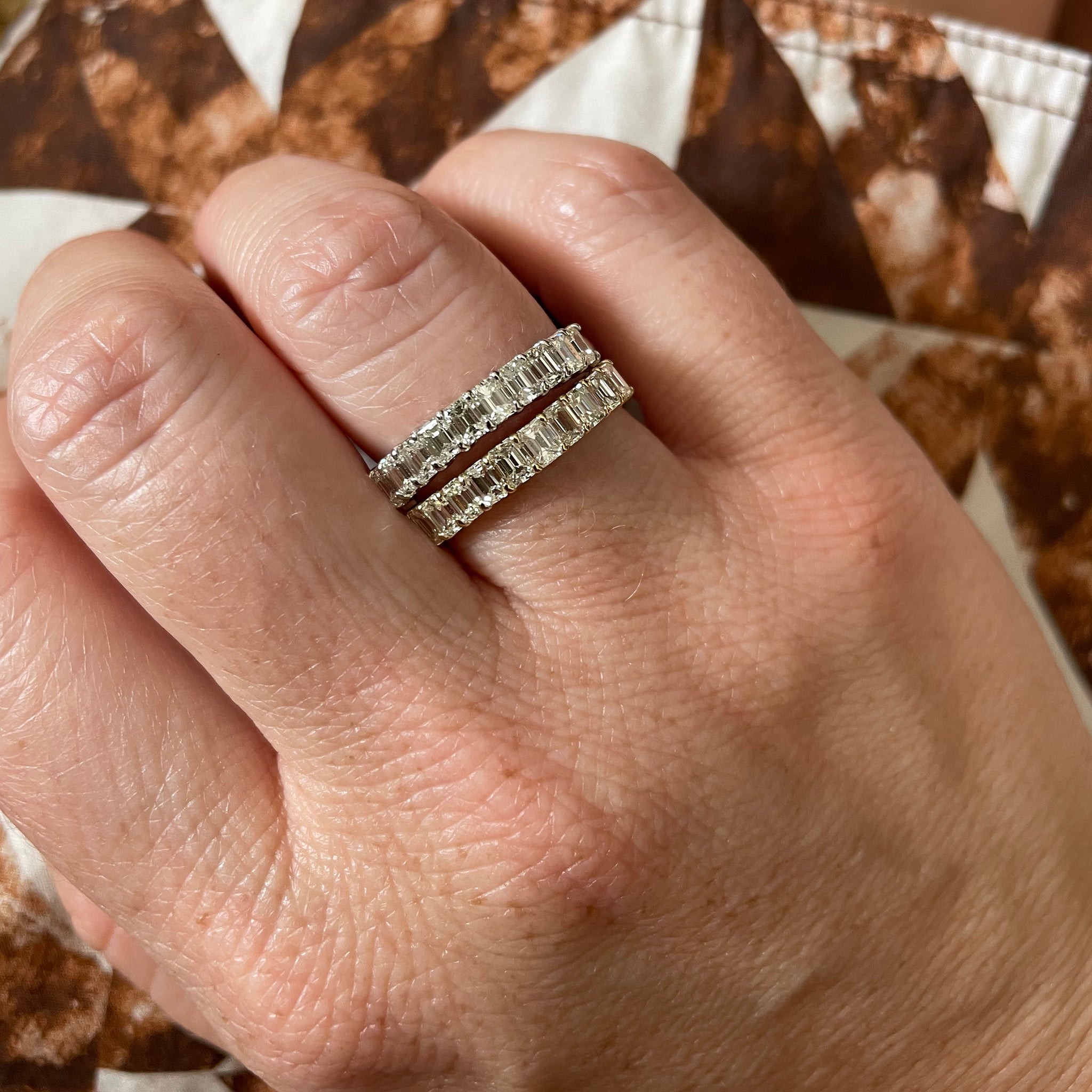 This halfway band features 10 emerald-cut diamonds secured by shared prongs in 14K yellow gold.