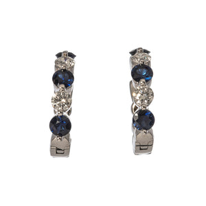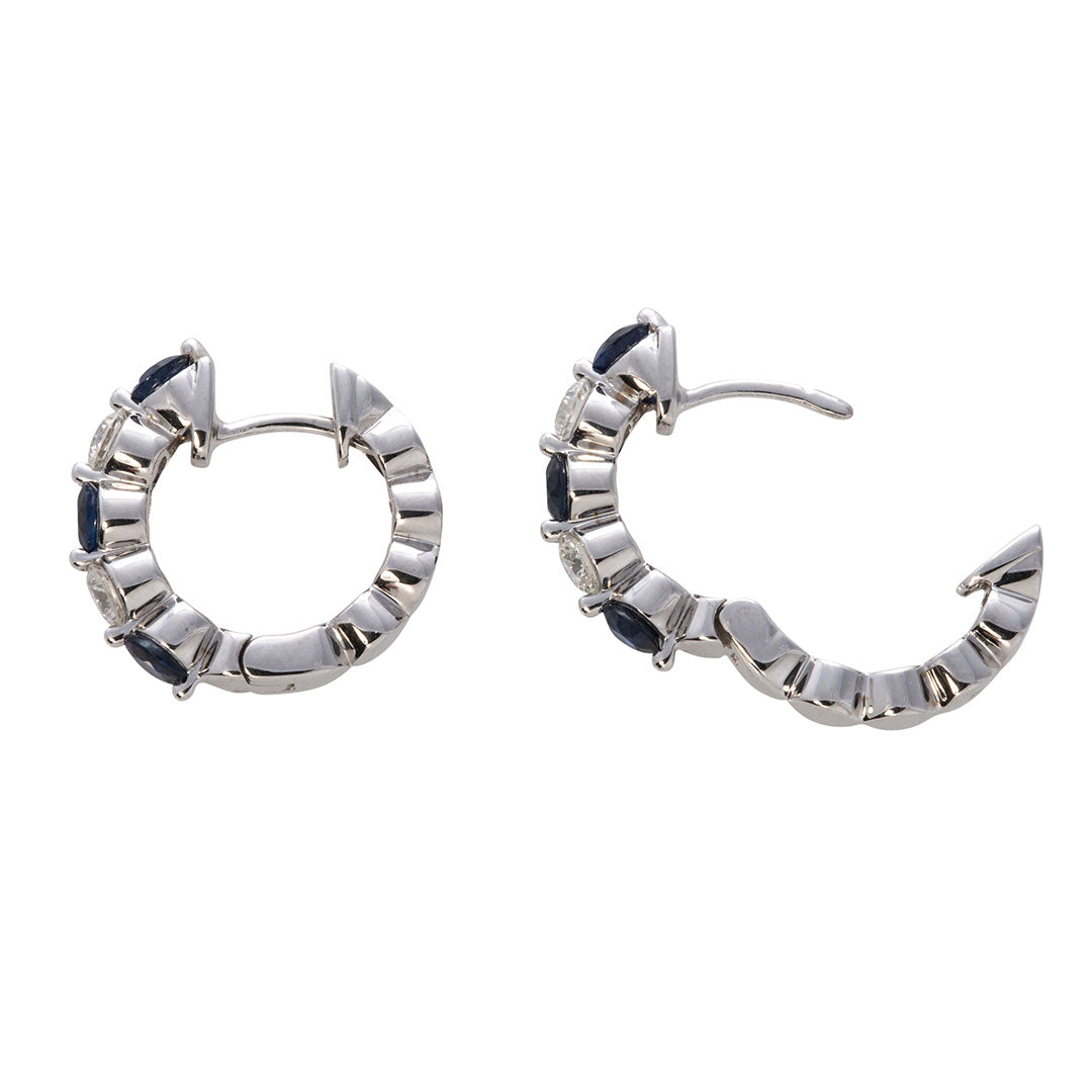 This pair of small hoop earrings features 3 round blue sapphires alternating with 2 round brilliant diamonds secured by shared prongs in 14K white gold.