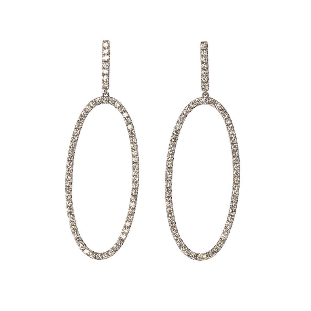 This pair of earrings features forward-facing oval hoop drops suspended from vertical bars with pavé round brilliant diamonds in 14K white gold.