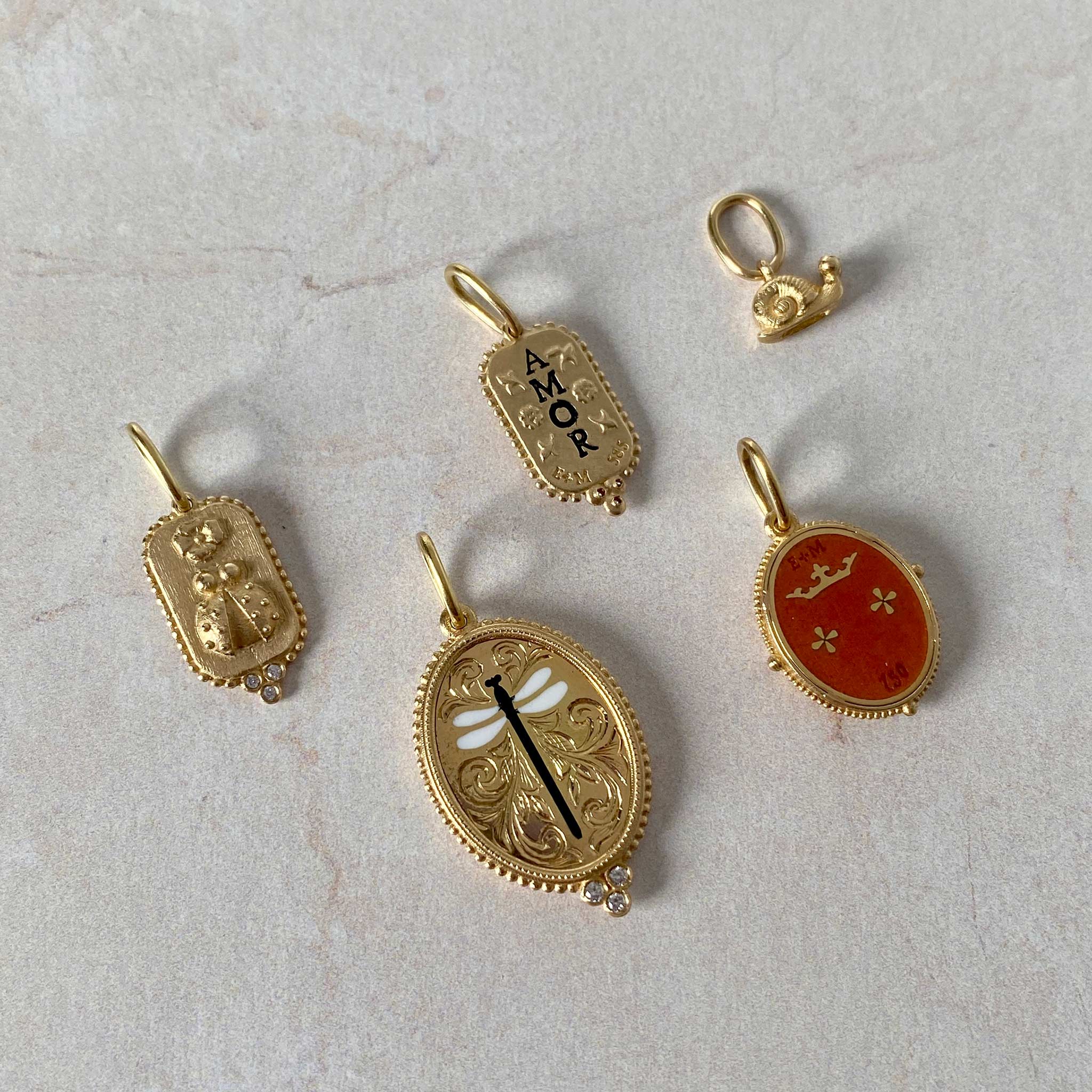 This Erica Molinari Small Charm features a queen bee motif surrounded by a beaded border with a trio of diamonds on the front and AMOR (love) with black enamel on the back.