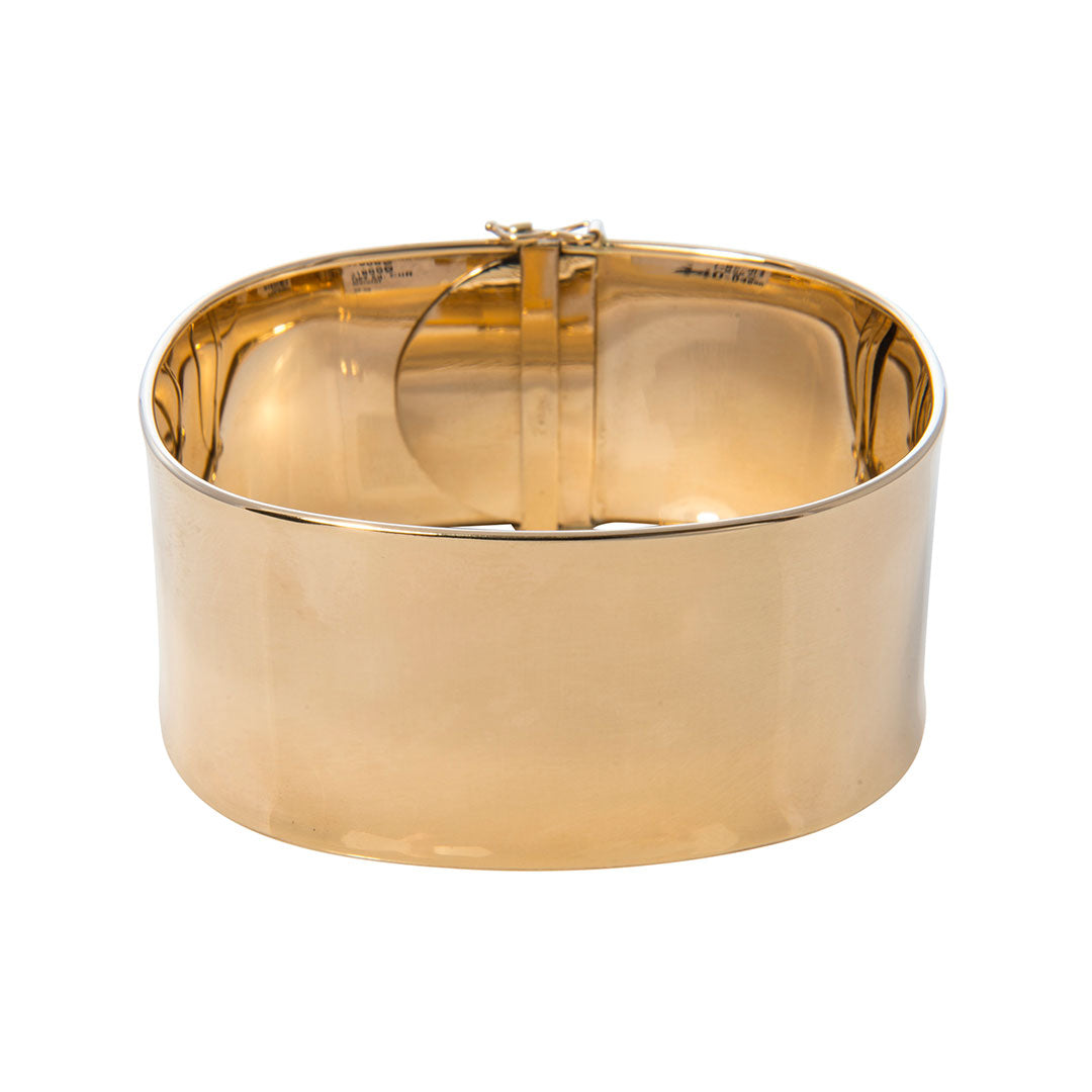 This extra-wide flex cuff bangle bracelet has a slightly flexible curve to the flat sides and is crafted of 14K yellow gold with a polished finish.