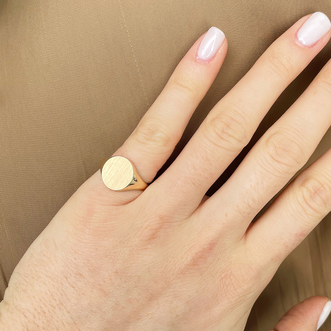 This oval signet ring is crafted in 14K yellow gold using the die-struck method for durability and density for hand engraving.