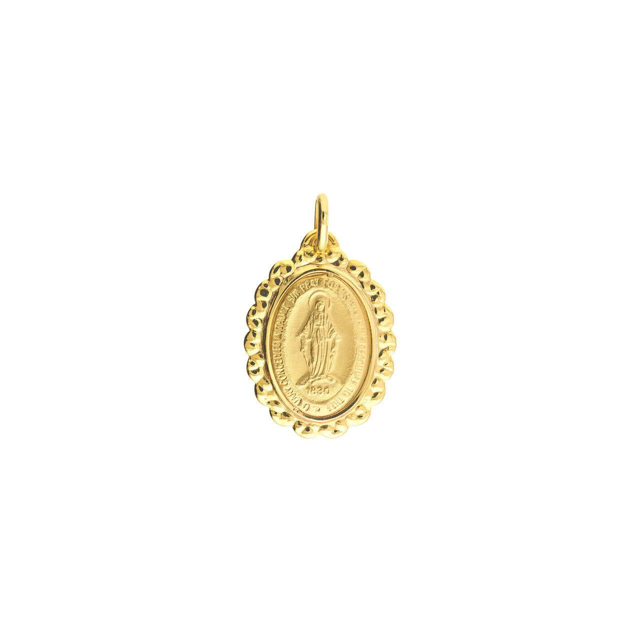 This Miraculous Mary Medal Pendant features a framed oval shape in 14K yellow gold. The back of the pendant is plain and can be engraved at an additional cost. Please contact us for engraving info.