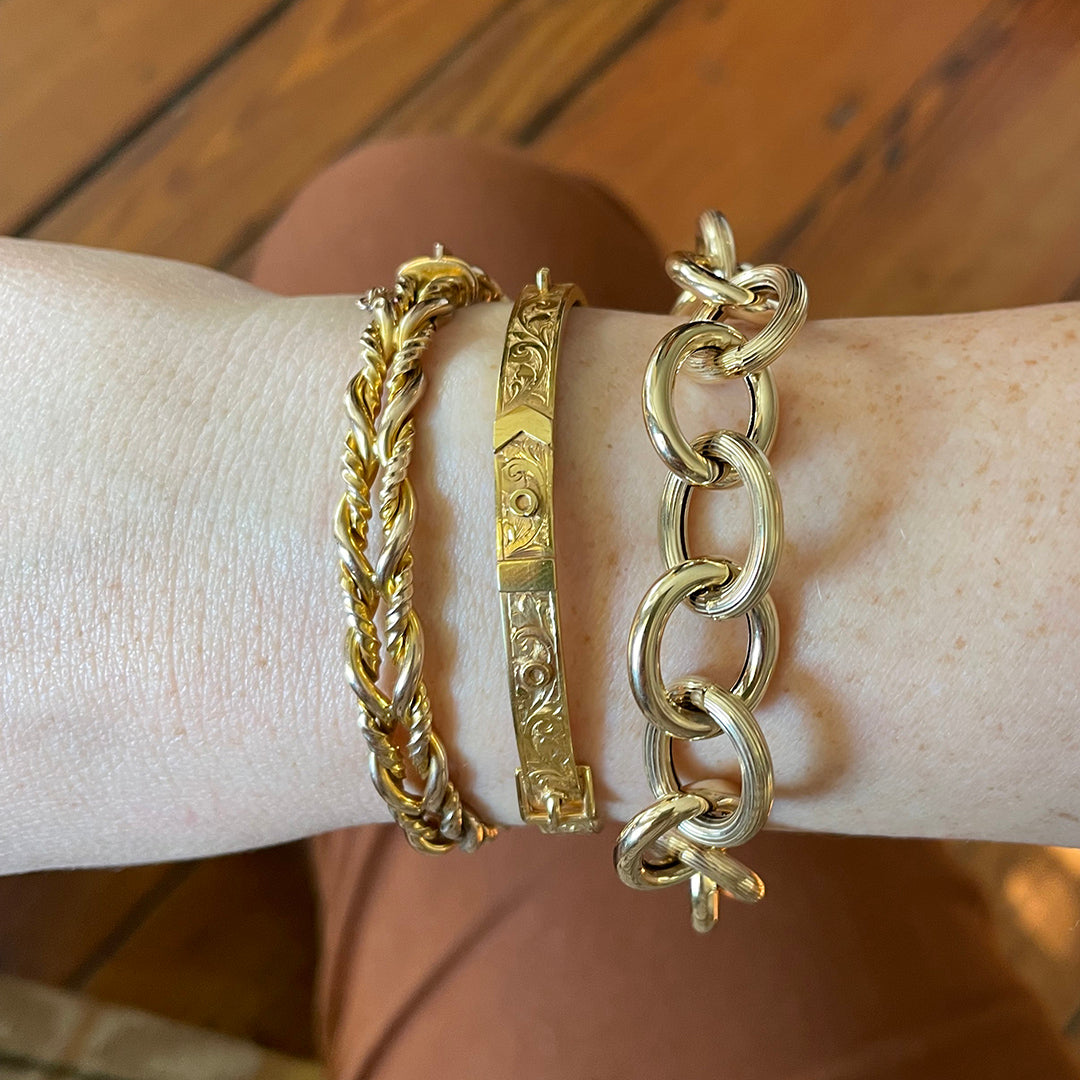 This large link chain bracelet features polished oval links alternating with ribbed textured oval links in 14K yellow gold and a spring-ring clasp closure.