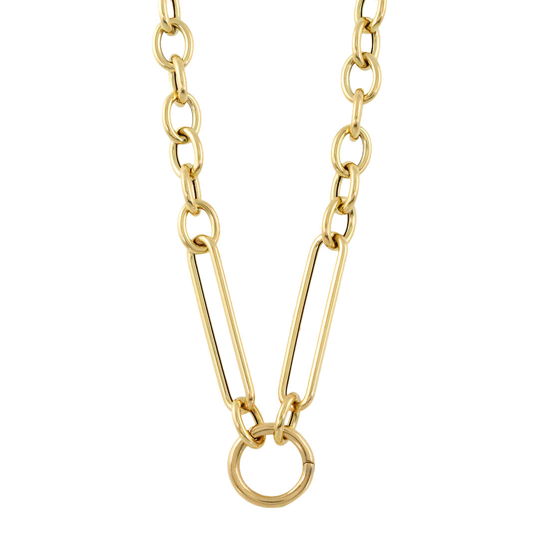 This chain necklace features small oval links, elongated oval links, and an o-clip charm clasp in 14K yellow gold. Charms and pendants are sold separately.