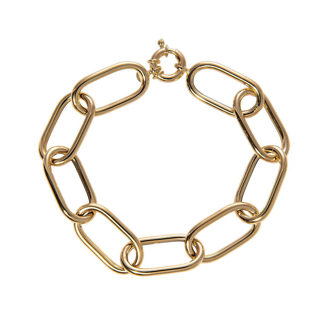 This bracelet features elongated oblong oval links in polished 14K yellow gold with a spring-ring clasp.