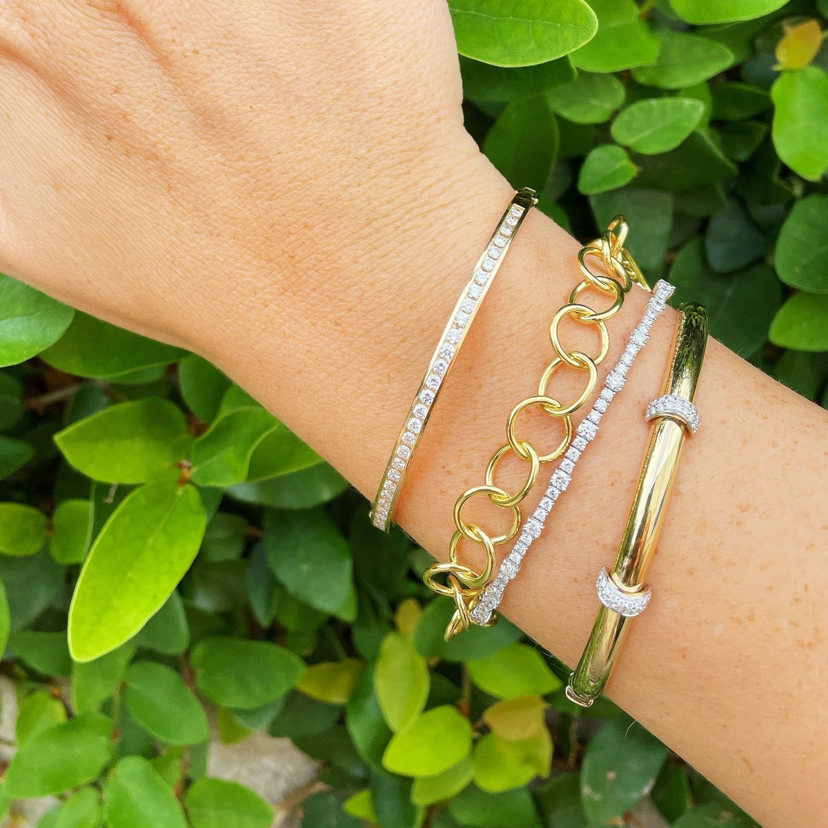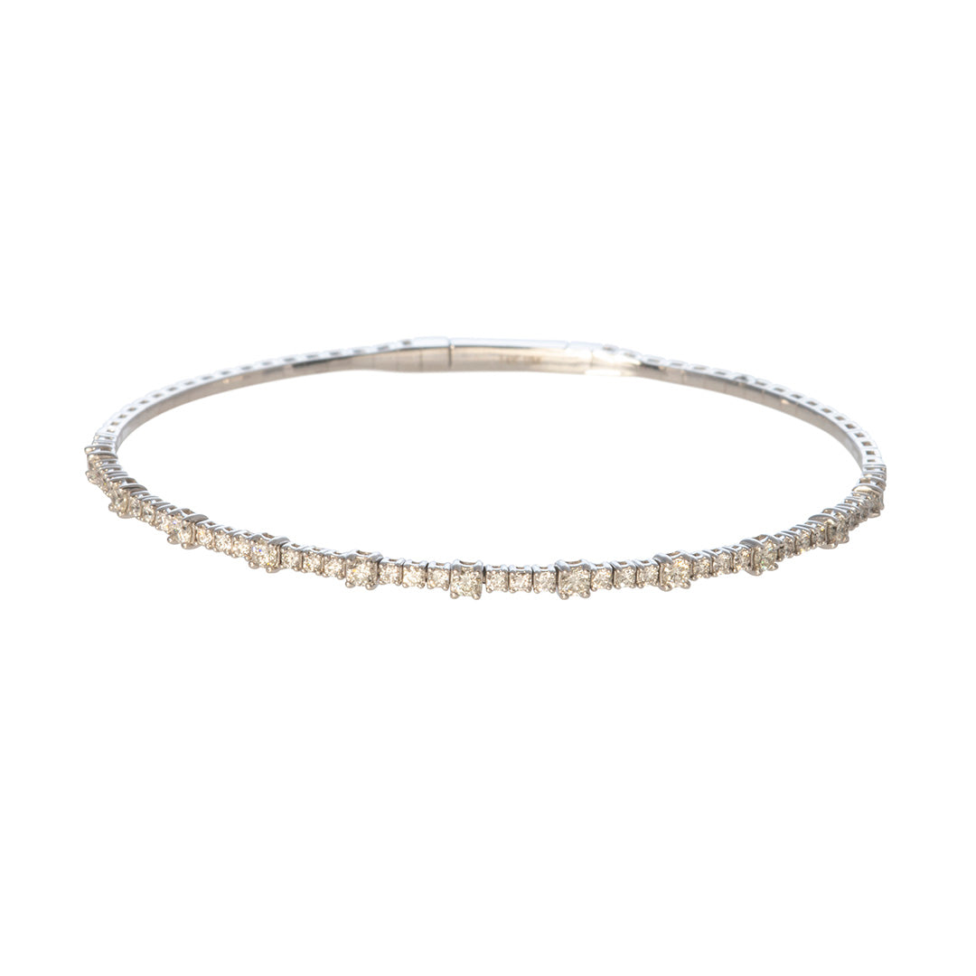 This flexible tennis bangle bracelet features round brilliant diamonds set halfway in 14K white gold.