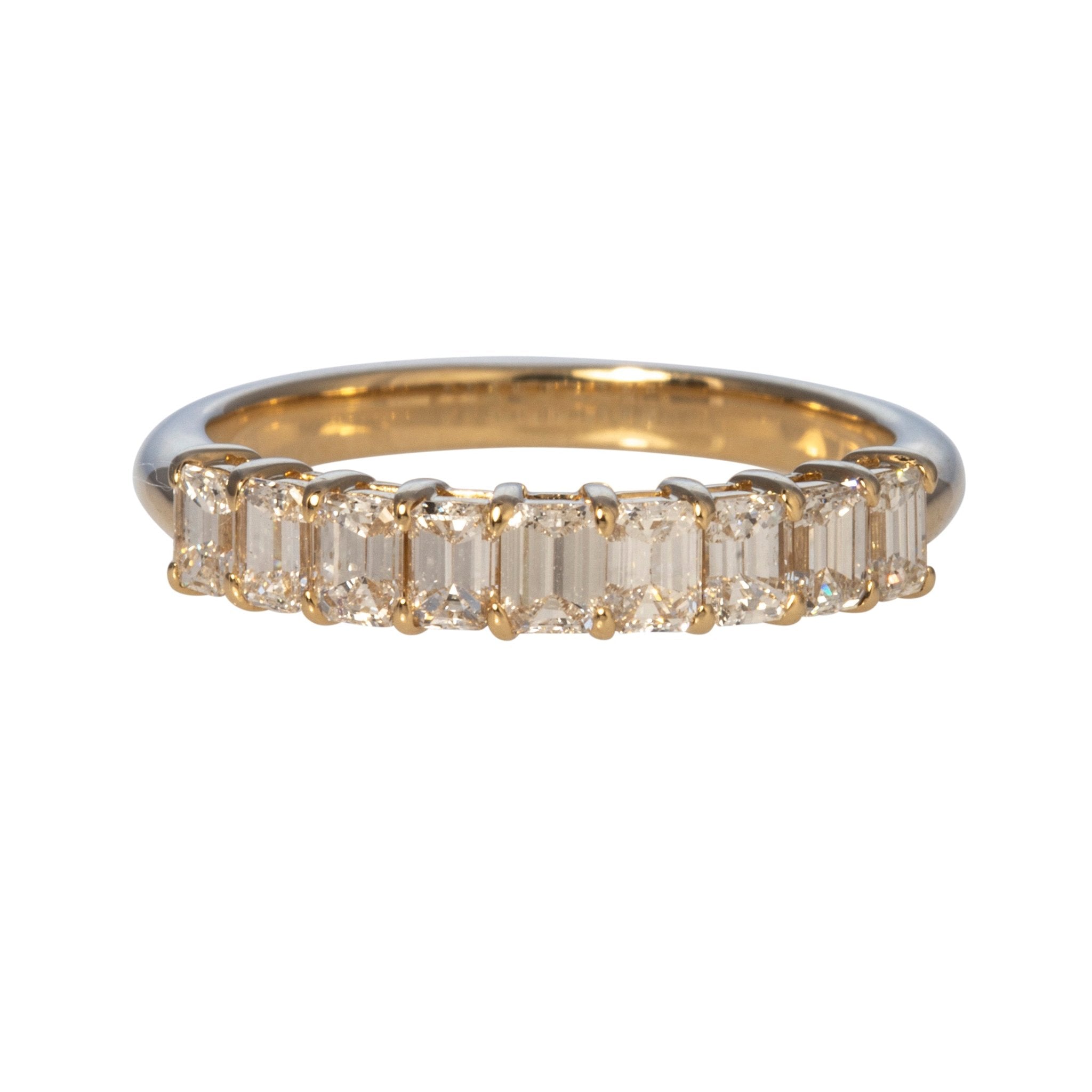 This halfway band features 9 emerald-cut diamonds secured by shared prongs in 14K yellow gold.