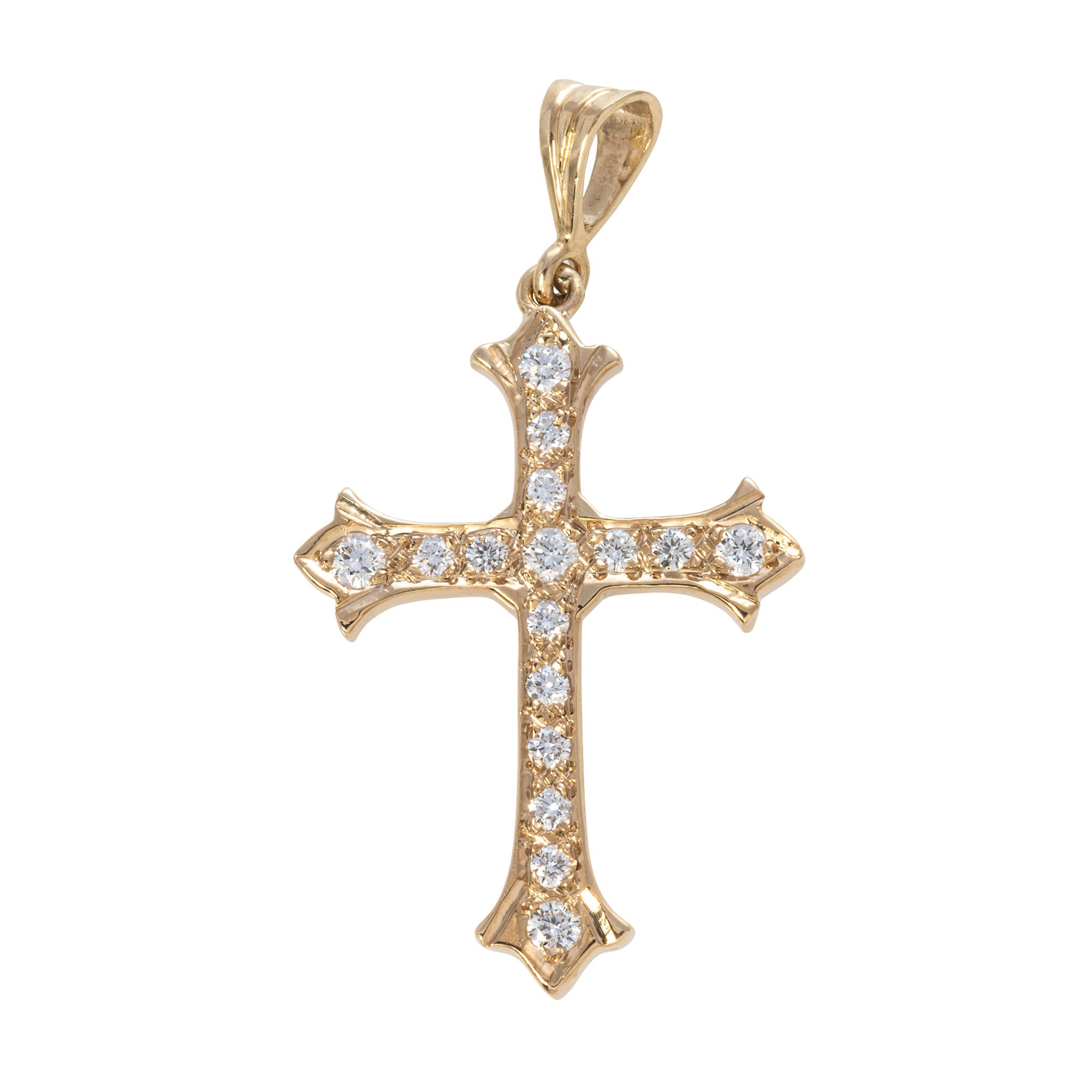 This vintage-style cross pendant features round brilliant diamonds in 14K yellow gold. Chains are sold separately.
