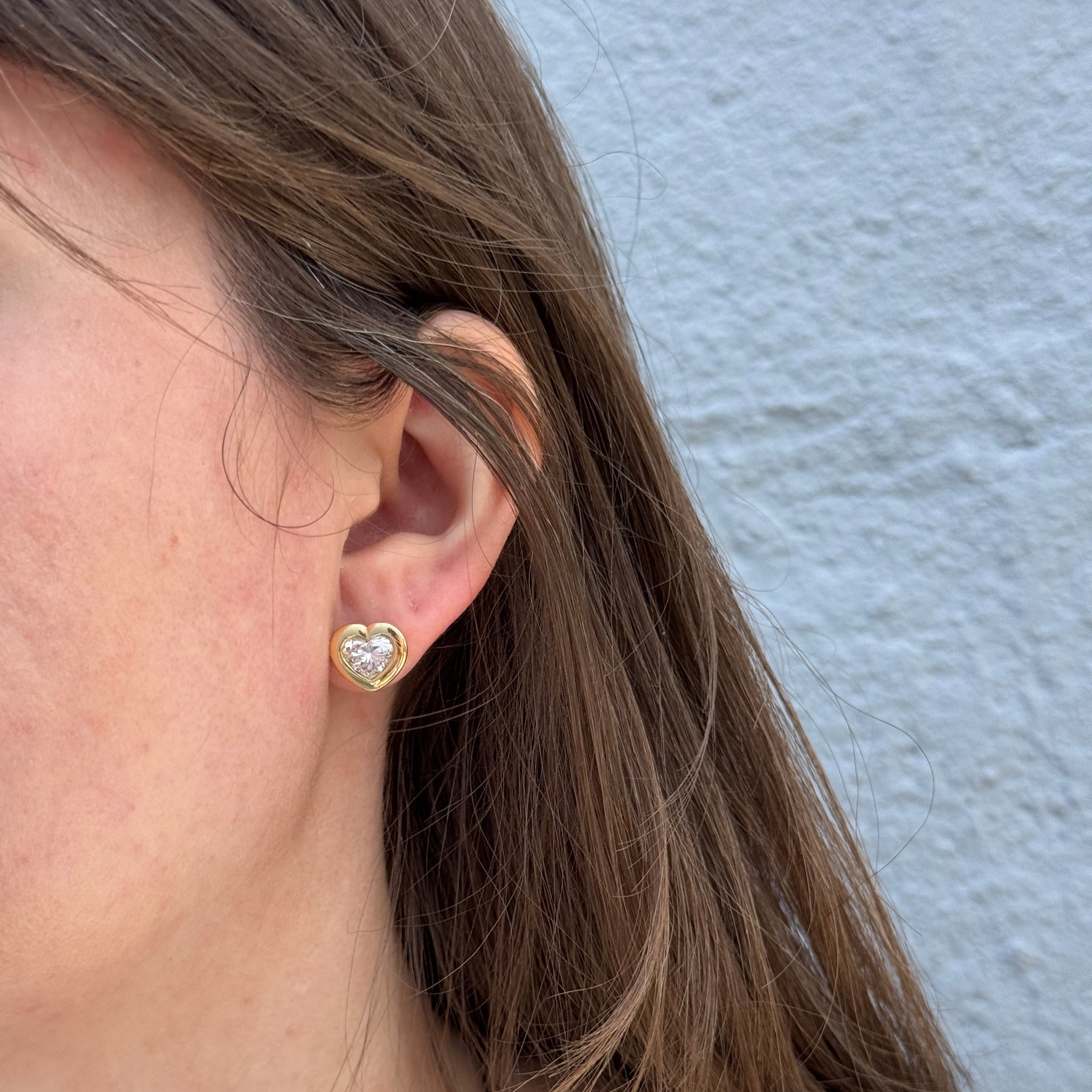 This pair of heart-shaped diamond earrings features a heart-cut diamond center bezel set in 18K yellow gold.