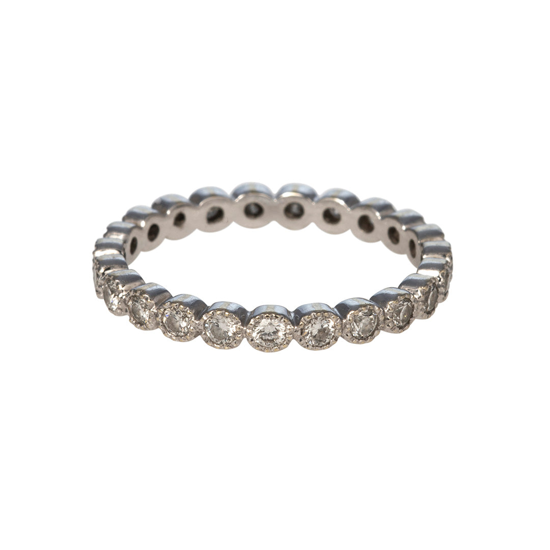 This eternity band features bezel-set round brilliant diamonds in 14K white gold with milgrain.