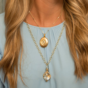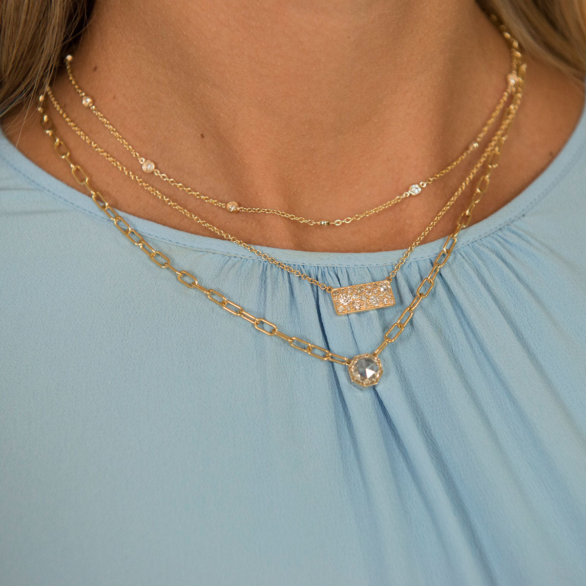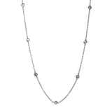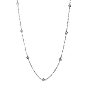 This diamond by the yard necklace features 7 bezel set round brilliant diamond stations along a 14K white gold cable chain.