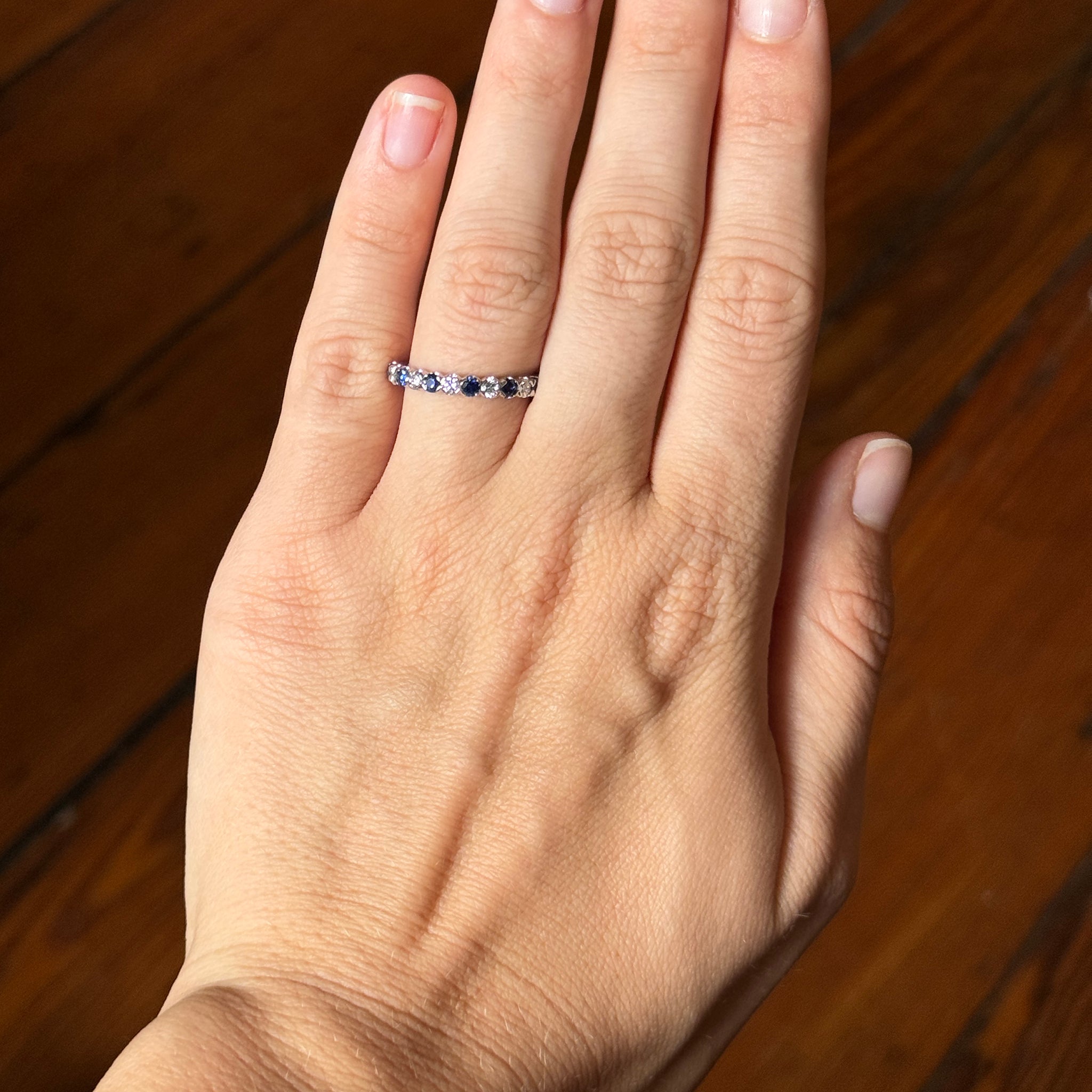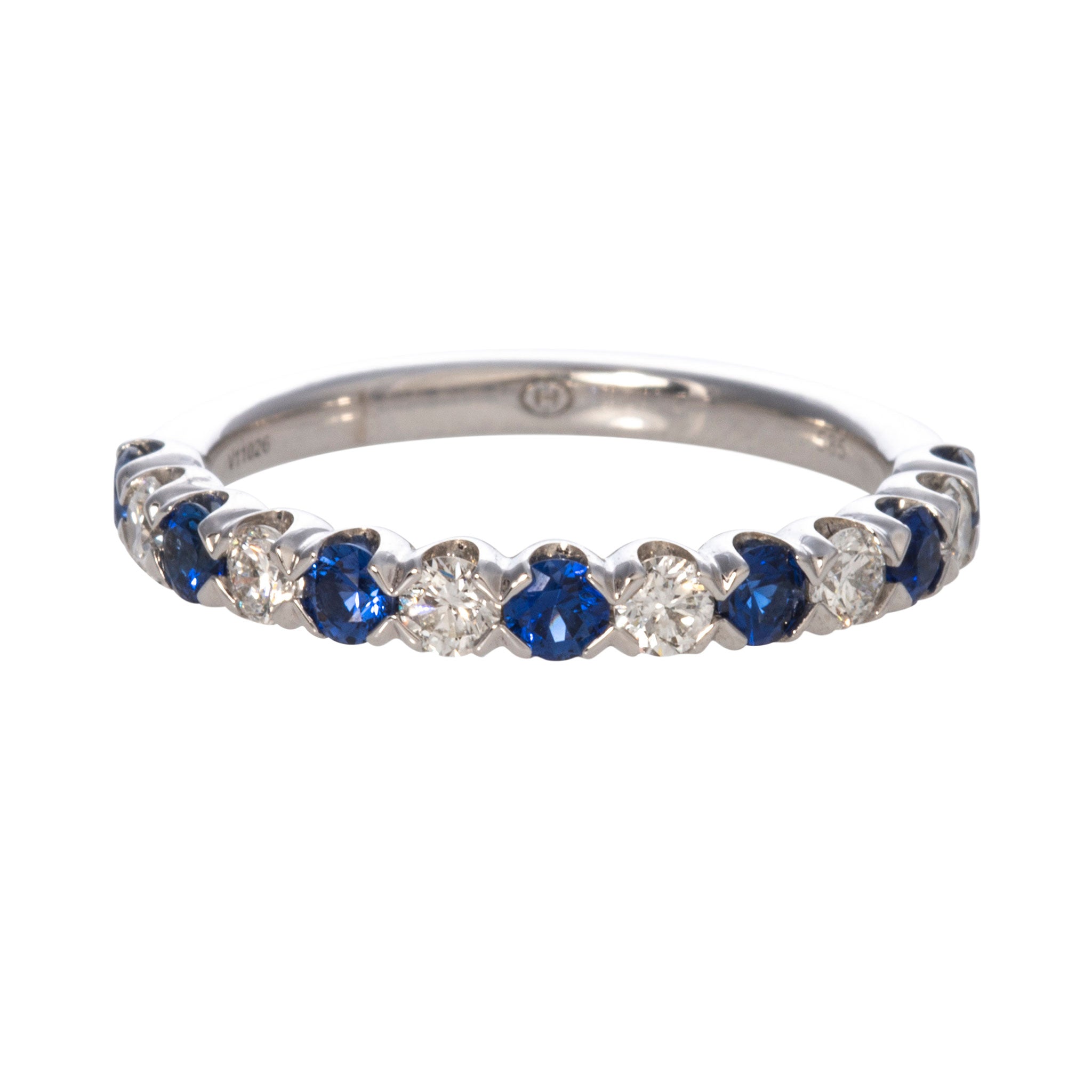 Christopher Designs Halfway Wedding Band features round sapphires alternating with round diamonds in 14K white gold shared prong settings going halfway around the finger.