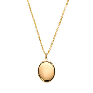 An adult-size plain polished 14K yellow gold-filled oval locket on a rope chain necklace. The outer shell is solid gold pressure-bonded to an inner core of high-quality brass.
