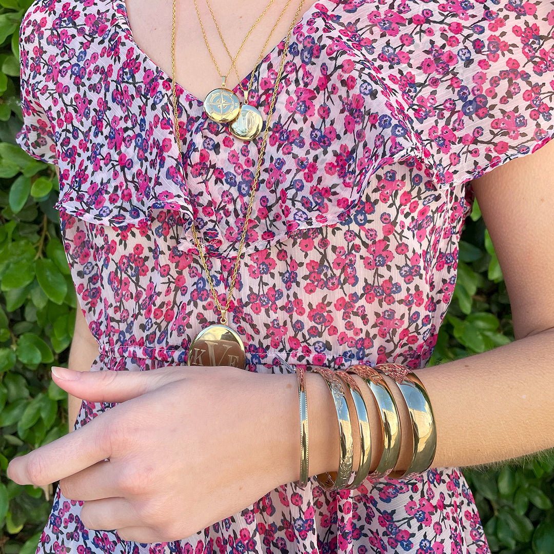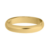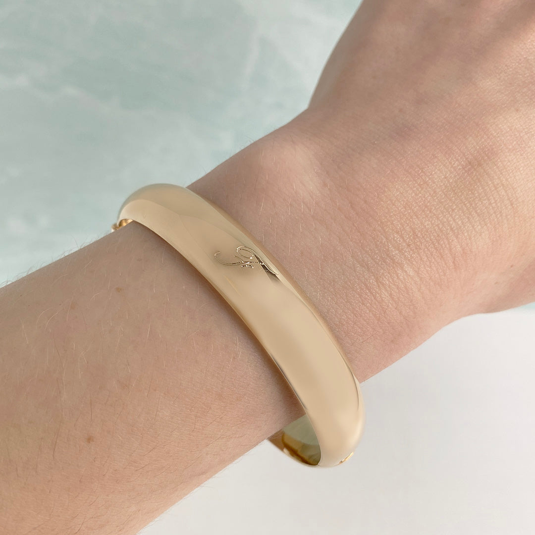 An adult-size plain polished 14K yellow gold-filled bangle bracelet. The outer shell is solid gold pressure-bonded to an inner core of high-quality brass.