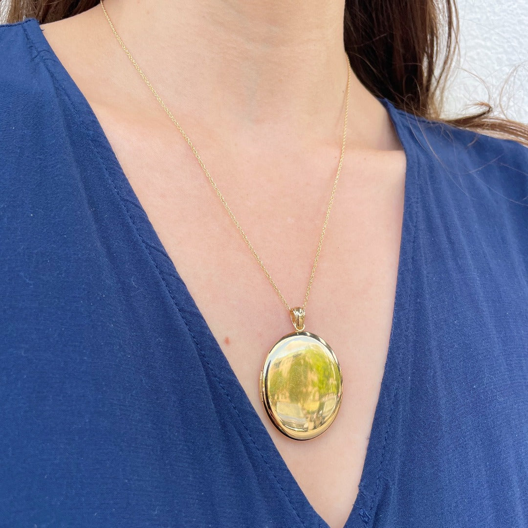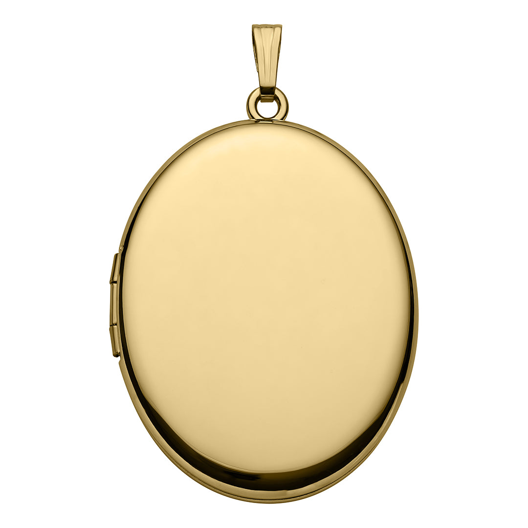An adult-size plain polished 14K yellow gold large oval locket pendant.