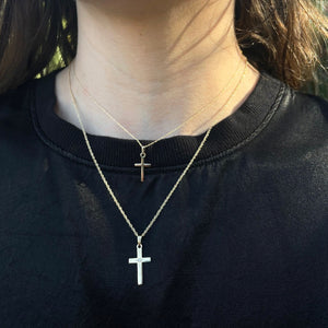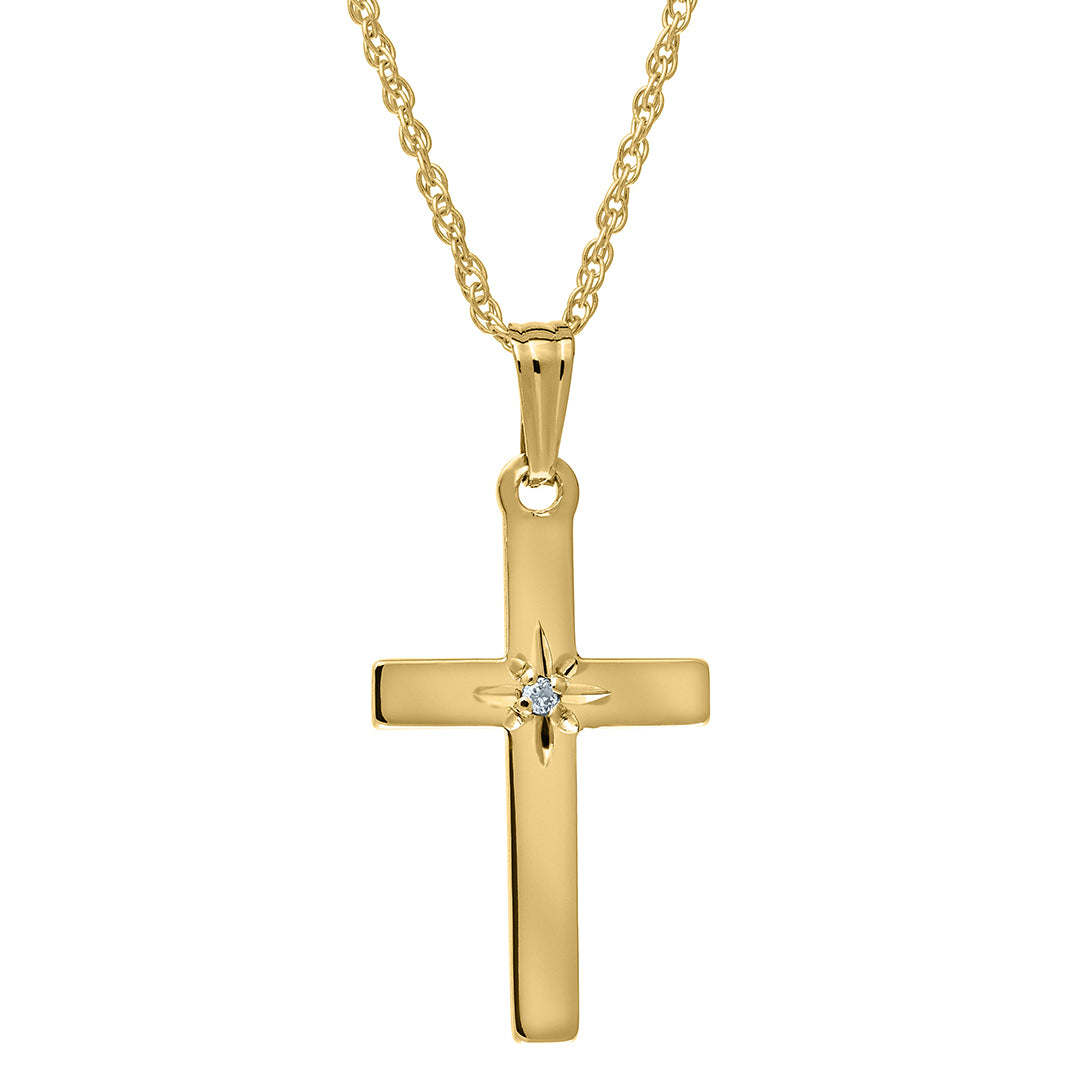 An adult-size polished 14K yellow gold cross pendant with a diamond accent on a heavy rope chain necklace.