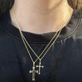 An adult-size polished 14K yellow gold engraved cross pendant on a heavy rope chain necklace.
