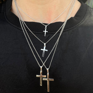 An adult-size plain polished sterling silver cross pendant on a Rolo-style chain necklace.