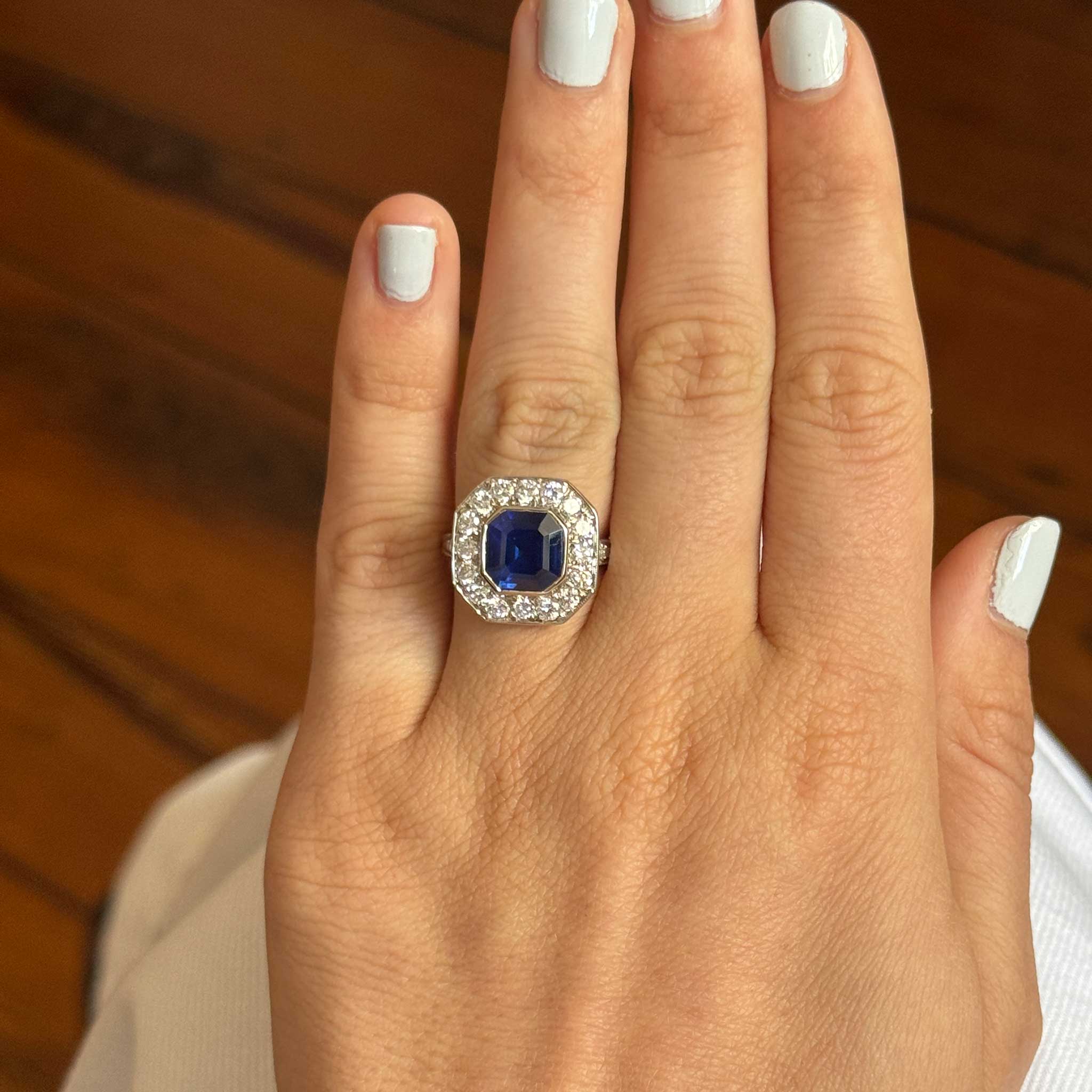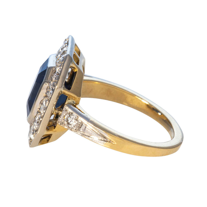 From our estate and antique collection, this Art Deco-style ring features a bezel set Asscher cut sapphire center surrounded by sixteen round brilliant diamonds in a two-tone 18K white gold and 18K yellow gold mounting with a diamond accent on the shoulders.