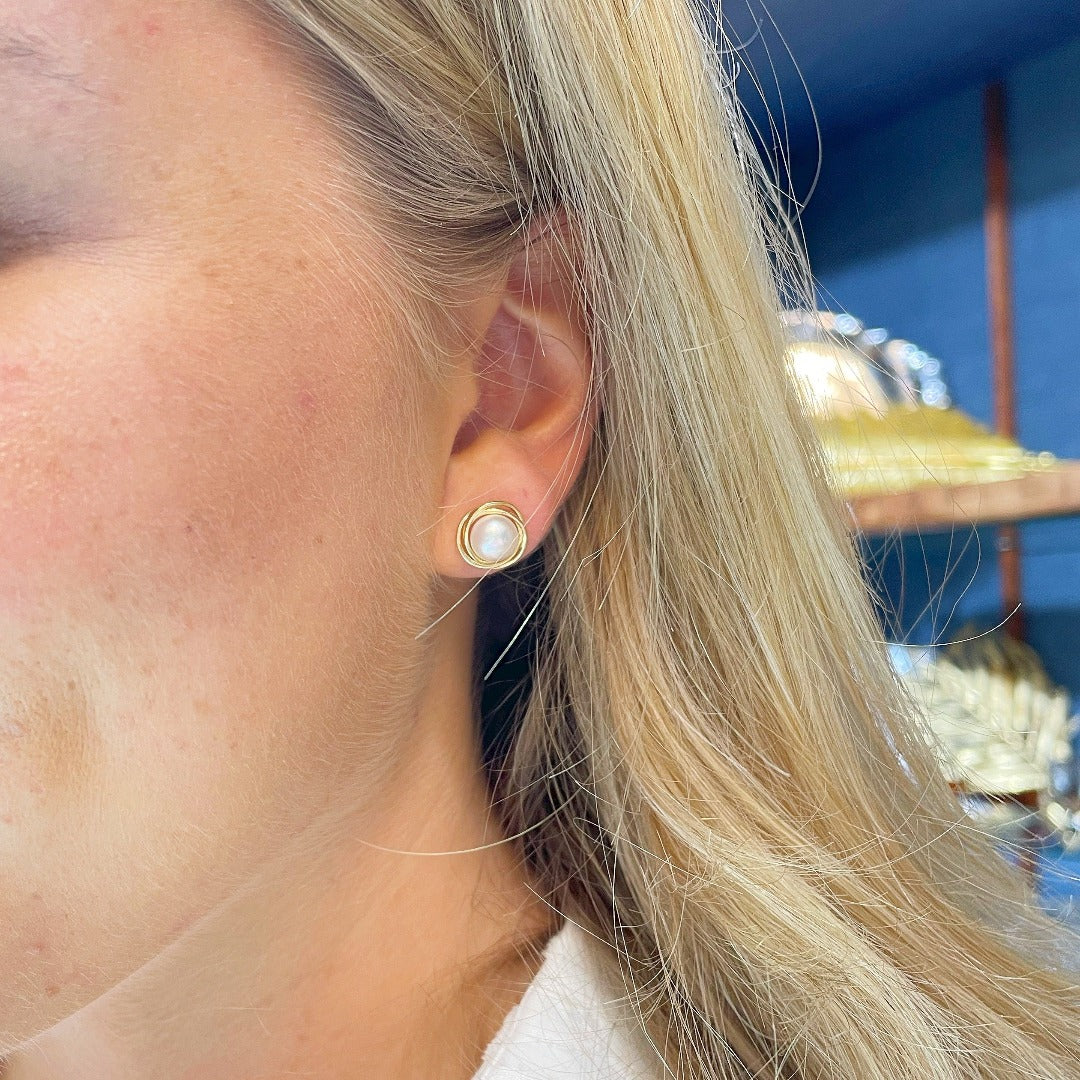 Button Pearl 14K Yellow Gold Knot Stud Earrings