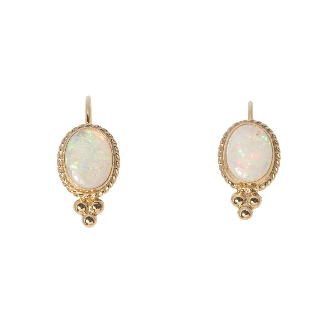 This pair of earrings features oval cabochon opals set in 14K yellow gold with twisted rope borders, granulation trios, and lever backs.