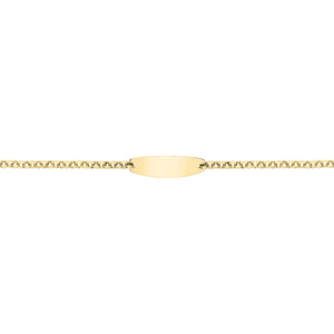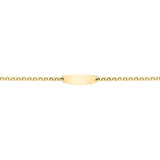 A child's plain, polished 14K yellow gold-filled identification bracelet with an engravable oval plaque centered on a chain. The outer shell is solid gold pressure-bonded to an inner core of high-quality brass.