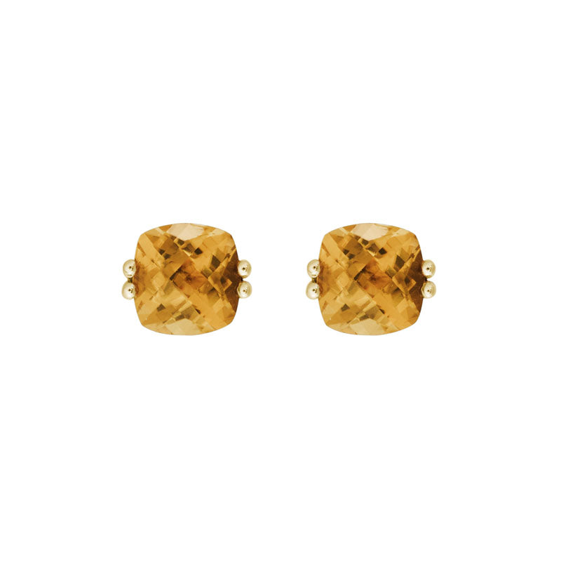 This pair of birthstone stud earrings features cushion-shaped citrine stones prong set in 14K yellow gold with postbacks for pierced ears.