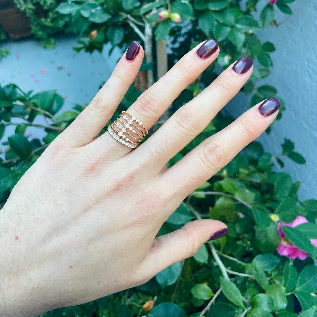 This five-row ring features diamond accents and beaded rows in 14K yellow gold.