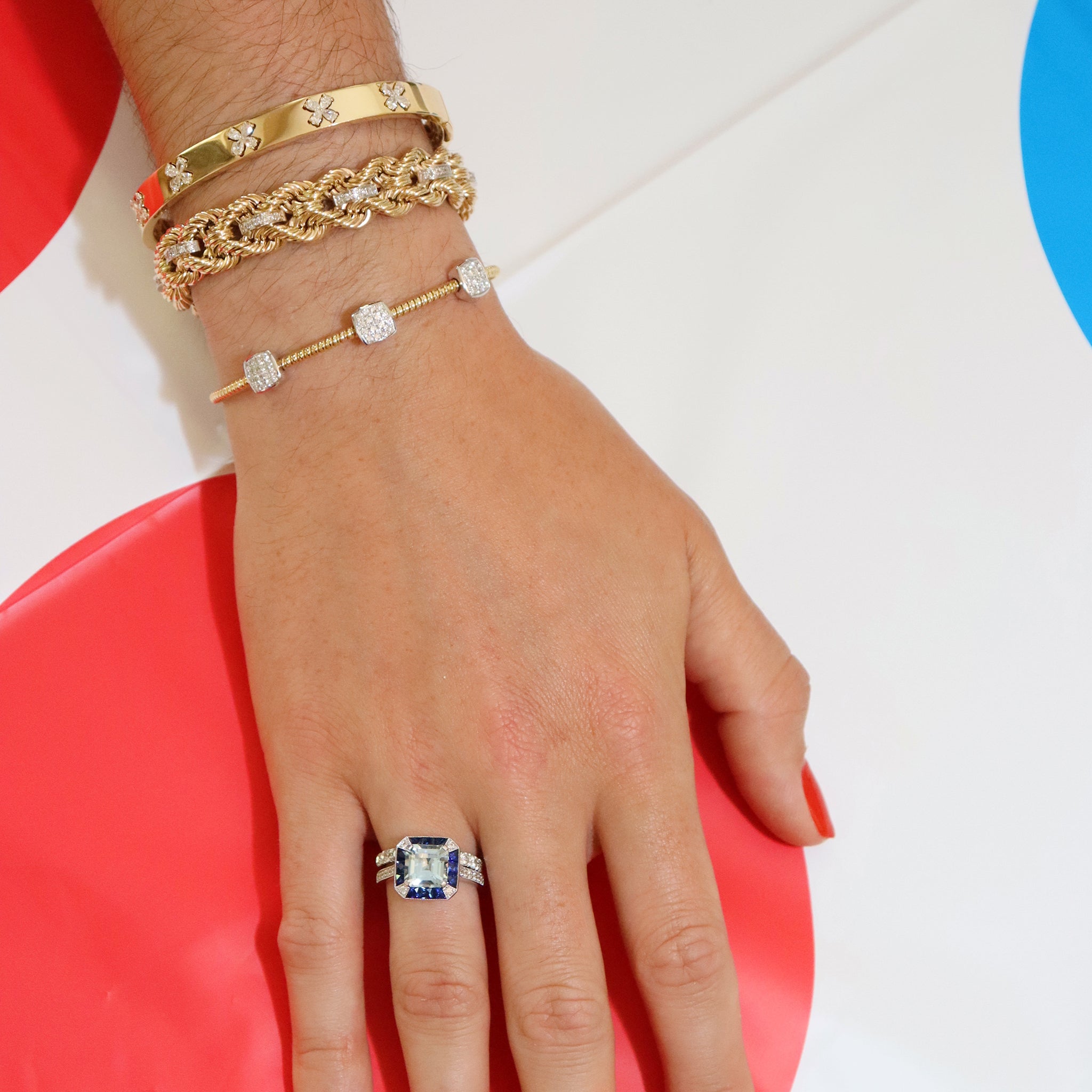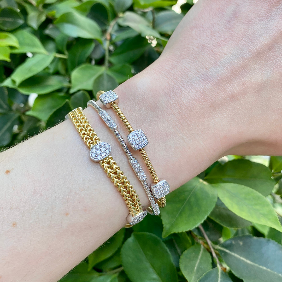 This two-tone flexible open cuff bangle in 18K yellow gold features three cushion-shaped stations with pavé round brilliant diamonds in 18K white gold.