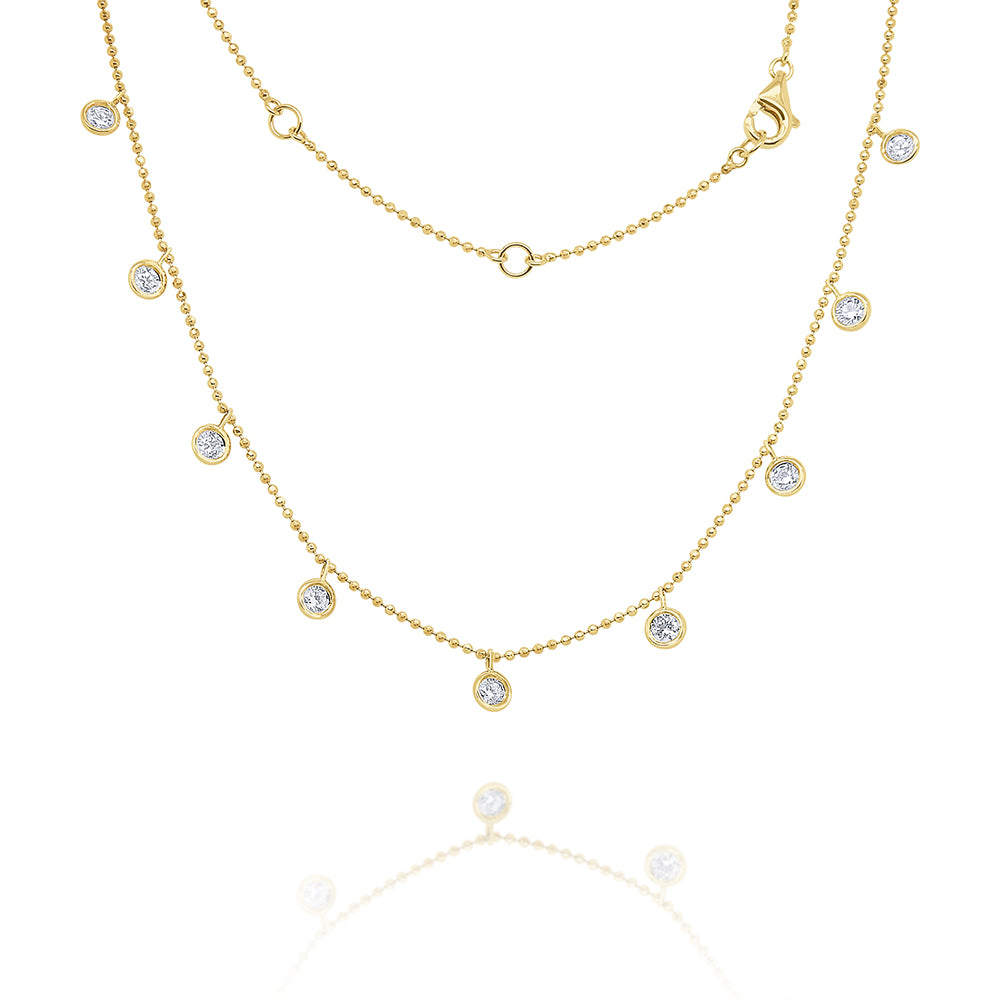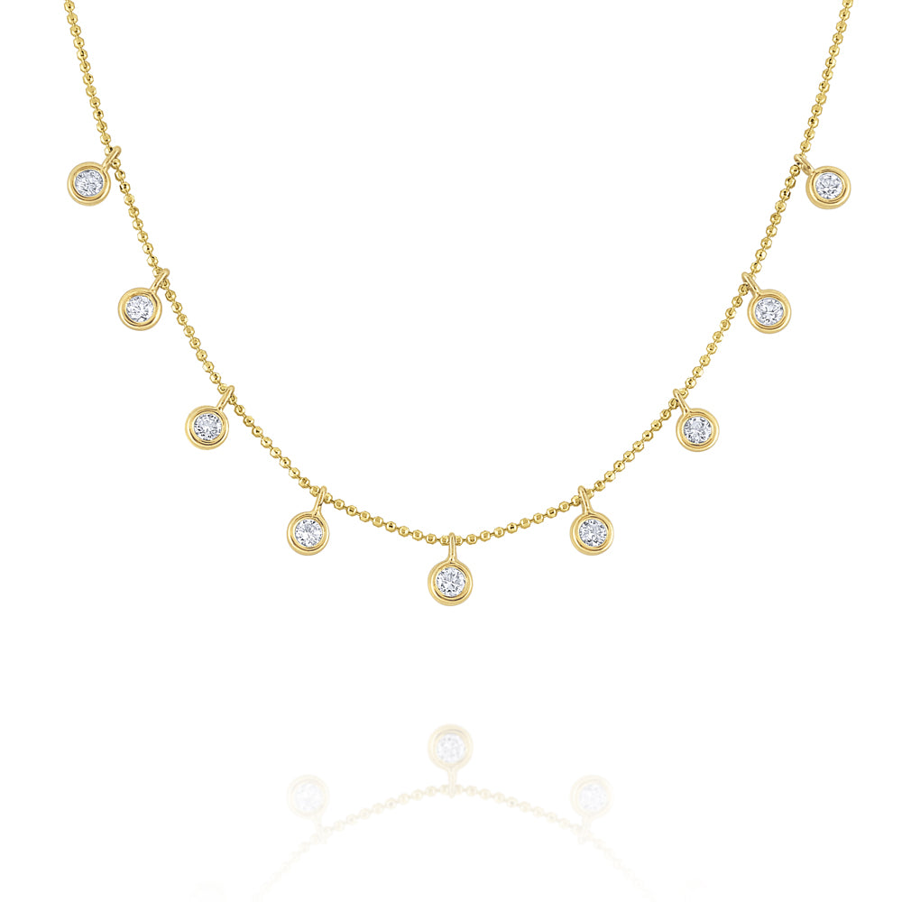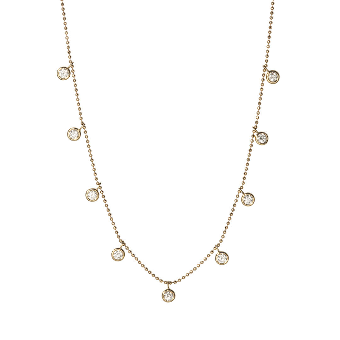 This necklace features nine bezel-set round brilliant diamond station drops suspended from an adjustable ball chain in 14K yellow gold.