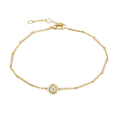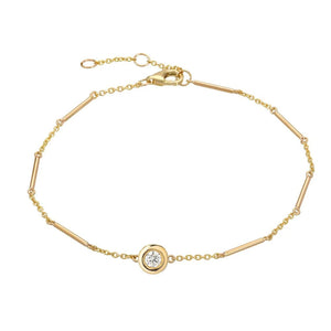 This delicate bar chain bracelet features a bezel set diamond station centerpiece in 14K yellow gold.