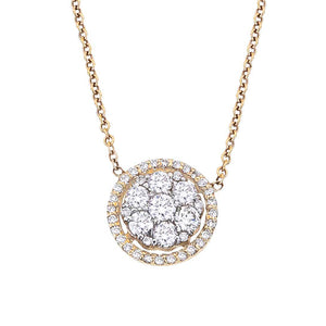 This pendant necklace features a cluster of round brilliant diamonds surrounded by a halo of pavé diamonds, centered on a cable chain in 14K yellow gold.