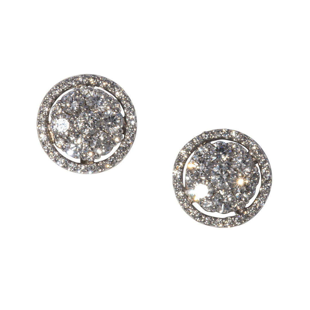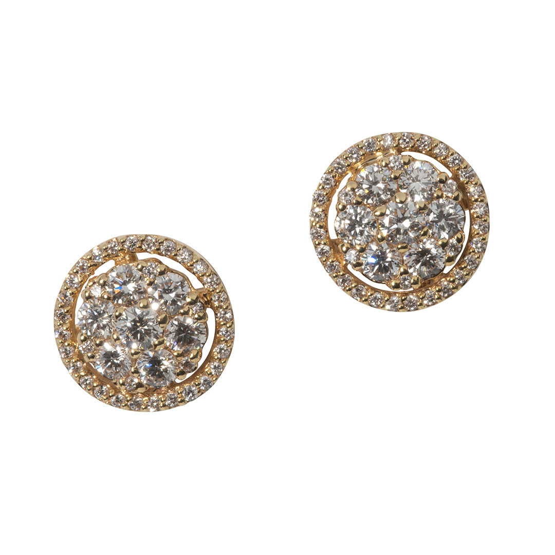 This pair of stud earrings features a cluster of round brilliant diamonds surrounded by a halo of smaller round brilliant diamonds pavé set in 14K gold.