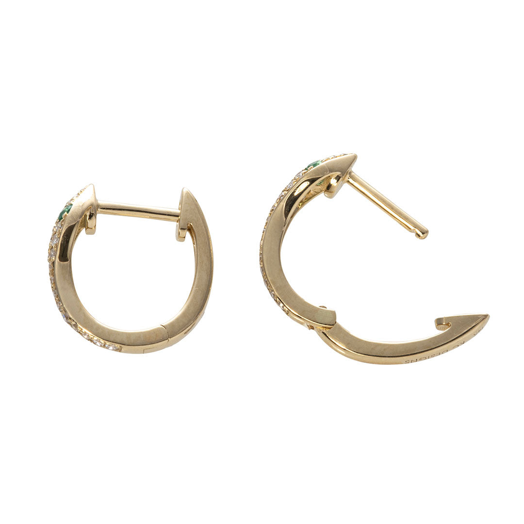 This pair of snake huggie hoop earrings feature pavé diamonds and emerald eyes in 14K yellow gold.