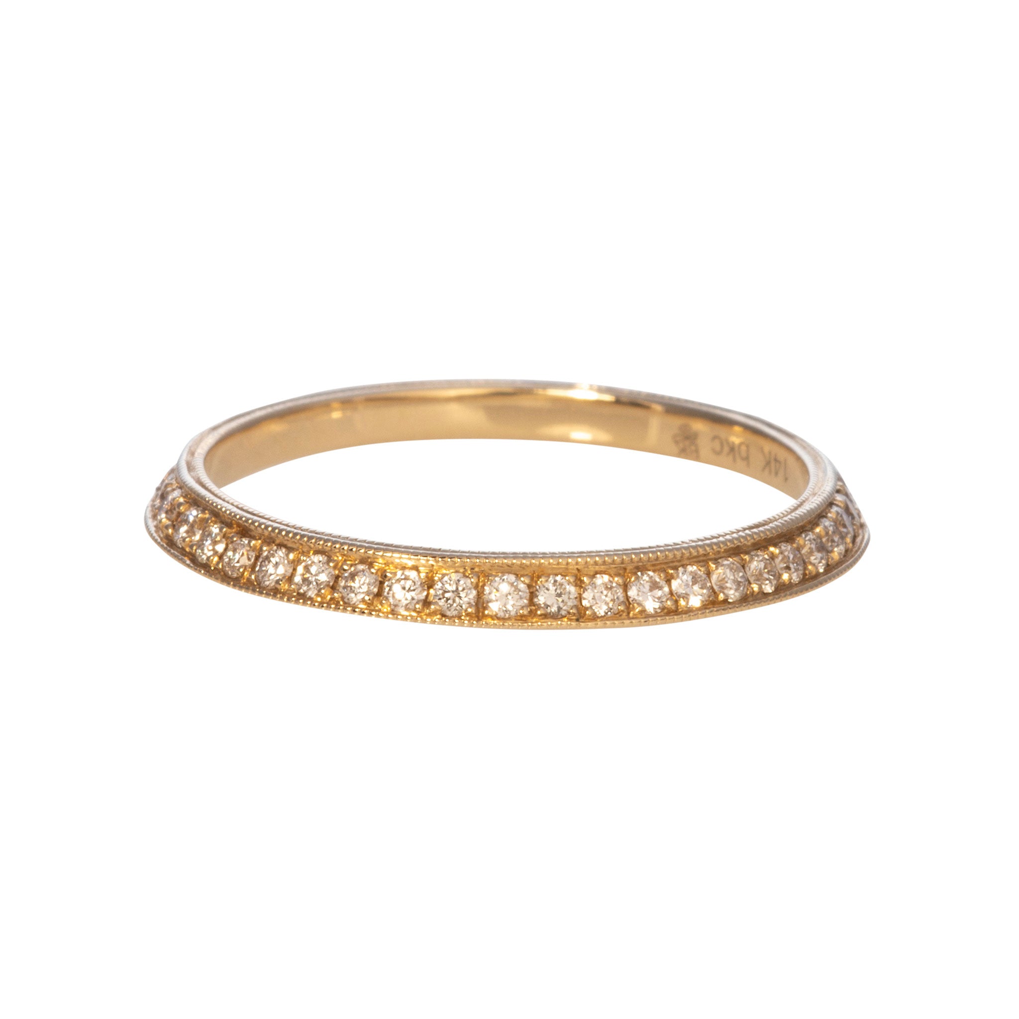 This half-knife edge eternity band features pavé round brilliant diamonds in 14K yellow gold with milgraining.