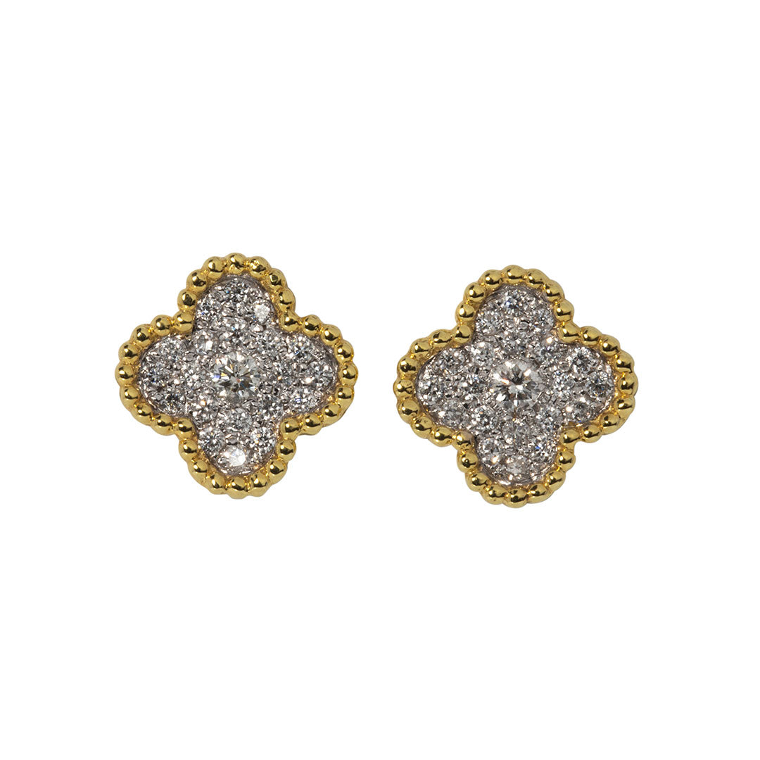 This pair of clover-shaped stud earrings features a cluster of pavé-set diamonds in 14K white gold with 14K yellow gold beaded edges.