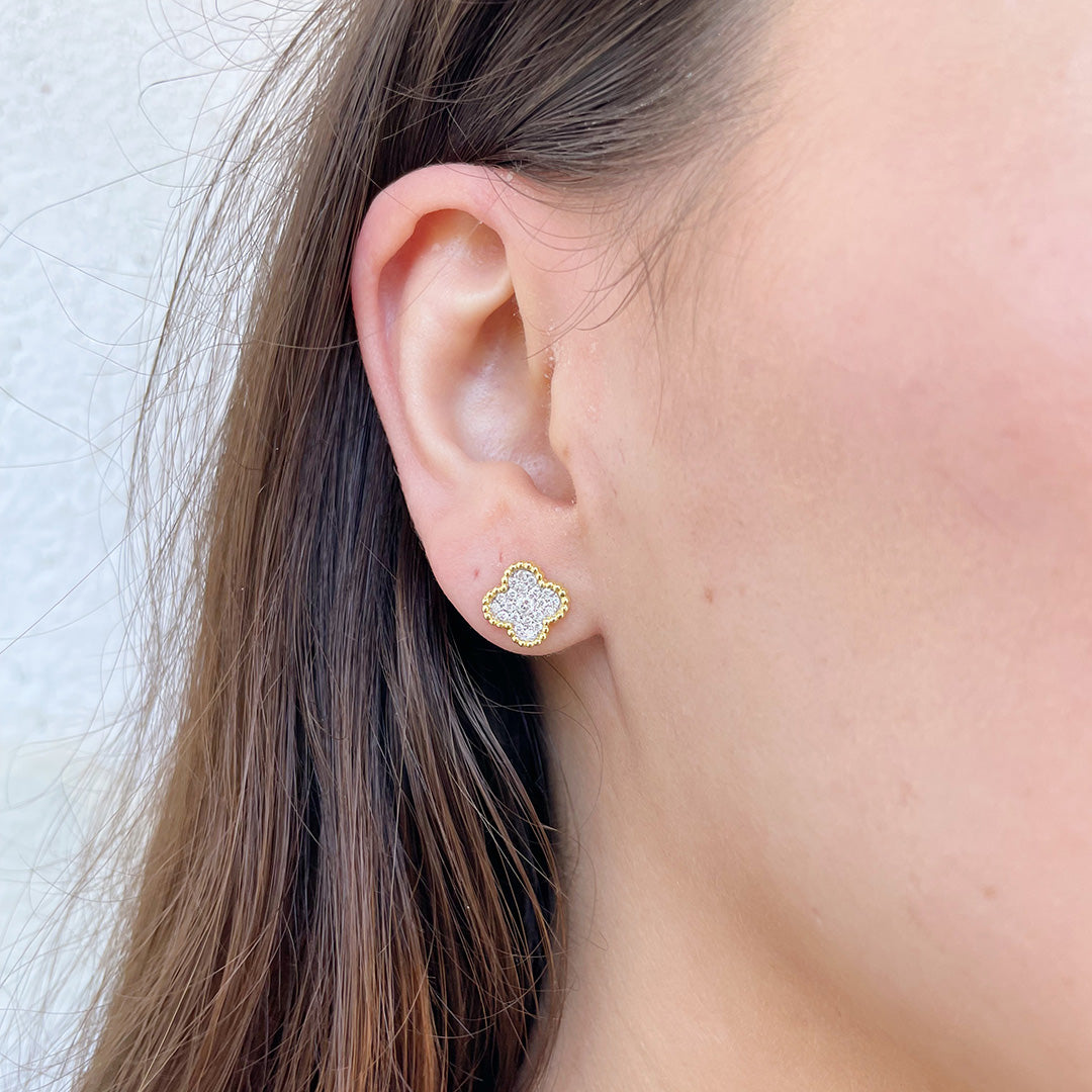 Diamond Pavé Cluster Clover Beaded 14K Gold Stud Earrings