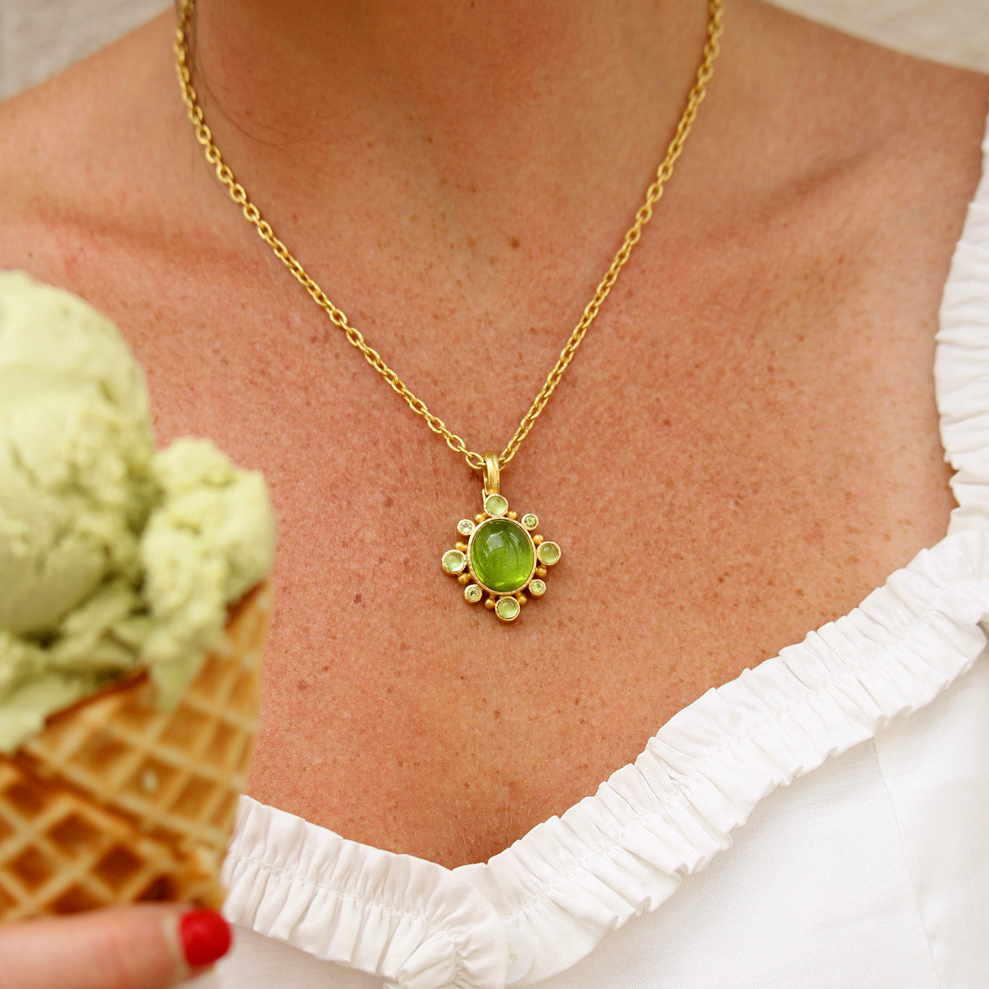 Elizabeth Locke Small Pendant features a vertical oval 13 x 15 mm cabochon peridot with alternating 4 mm round cabochon peridot, gold dots, and faceted 2.5 mm peridot on a thin bezel.