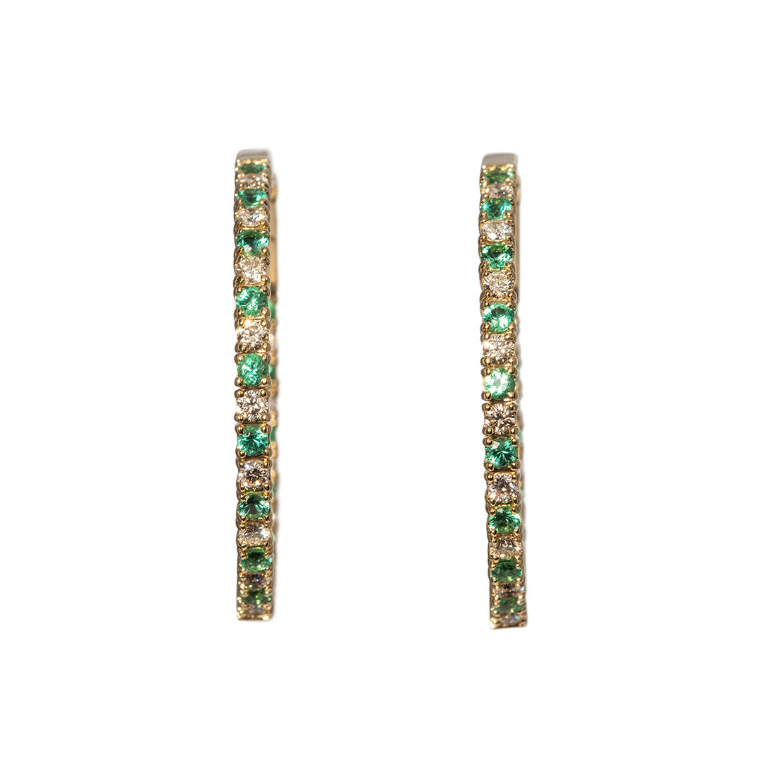 These flexible inside-out hoop earrings feature alternating round emeralds and round brilliant diamonds set inside and outside in 14K yellow gold.