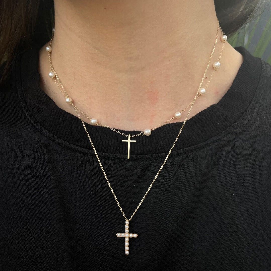 This necklace features a cross pendant with Freshwater cultured seed pearls on a chain in 14K yellow gold.