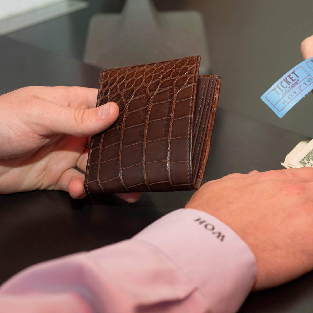 George Campsen Original Alligator Leather Bifold Wallet is handmade from genuine South Carolina alligators. The interior features six card slots, two concealed slots, and two main slots for full-size bills.