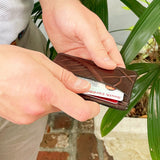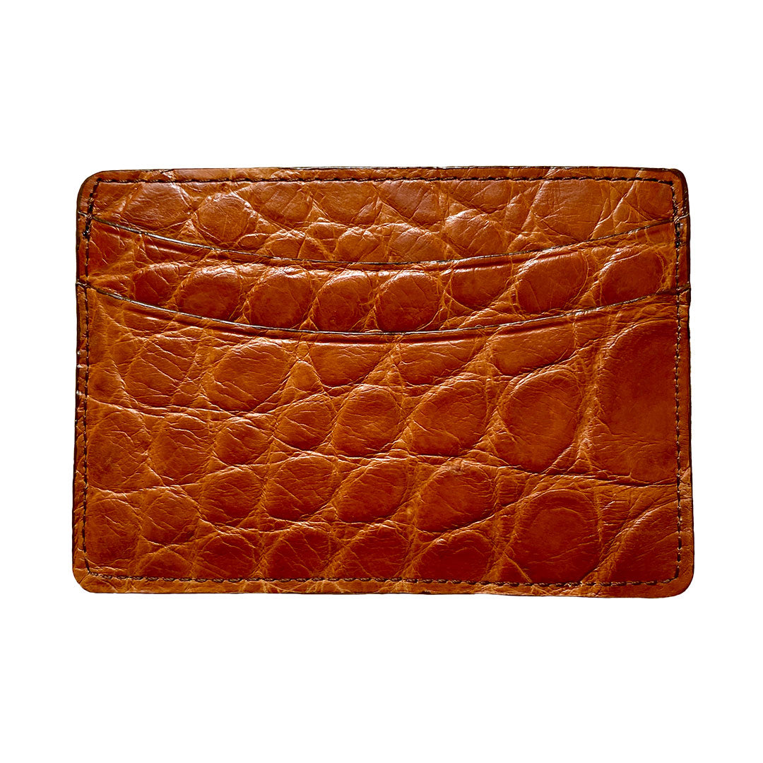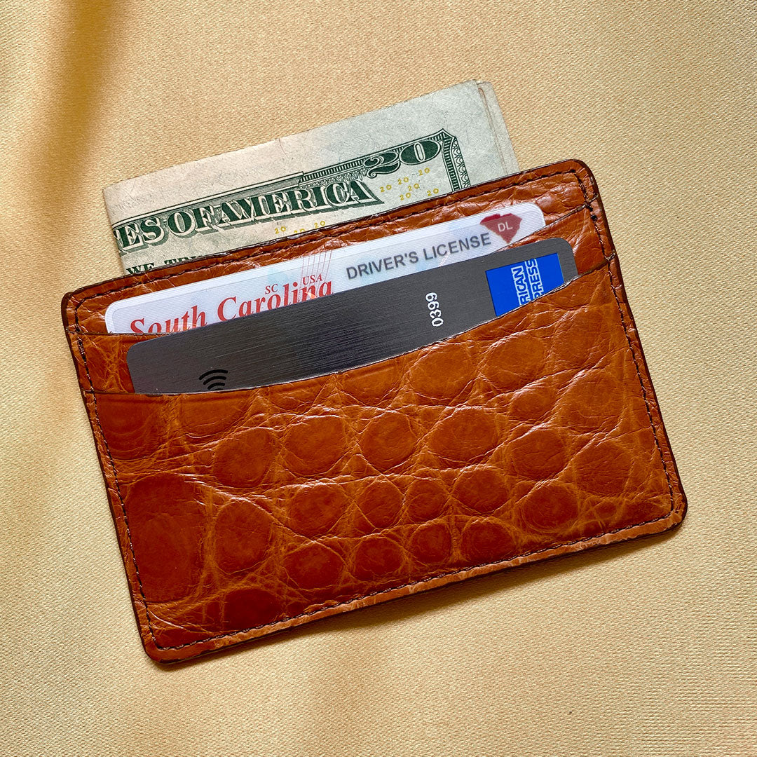 George Campsen Original Alligator Leather Card Holder Case is handmade from genuine South Carolina alligators. It features a central slot in the middle, and two card slots on either side (four card slots total) to hold credit cards, ID, or business cards.