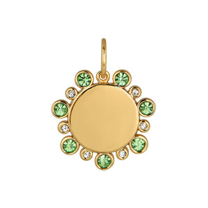Goldbug Collection’s August Birthstone Pendant features an engravable center surrounded by bezel-set light green and white crystals.