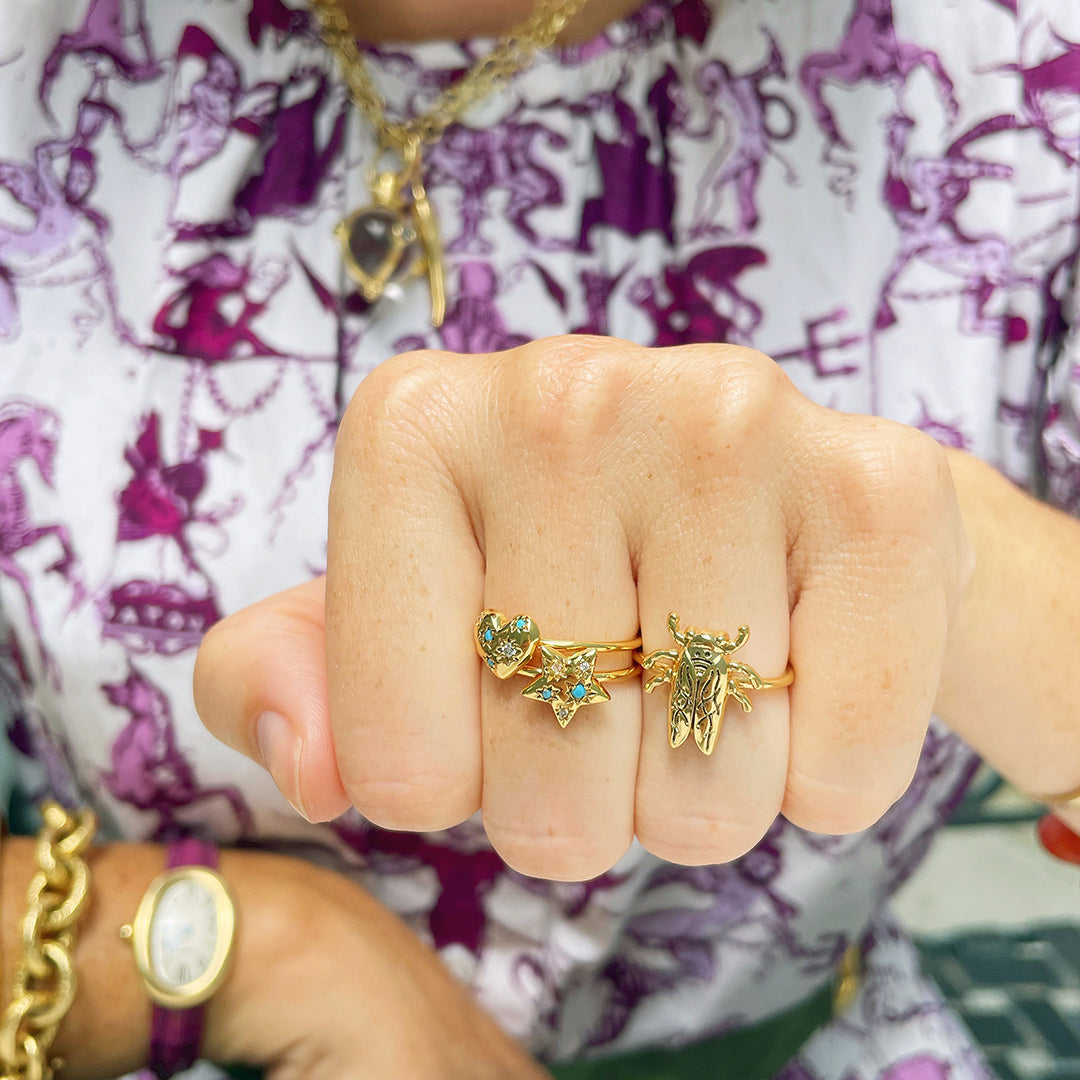 Goldbug Collection’s Baby Bug Ring features a thin, rounded, comfortable band, making it great to stack.