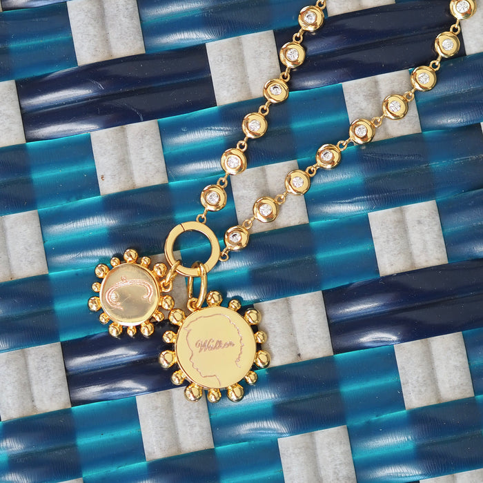 Goldbug Collection’s Bezel Charm Necklace features a chain with donut bezel set crystals and a charm holder clasp that opens and closes to allow charms to be added.