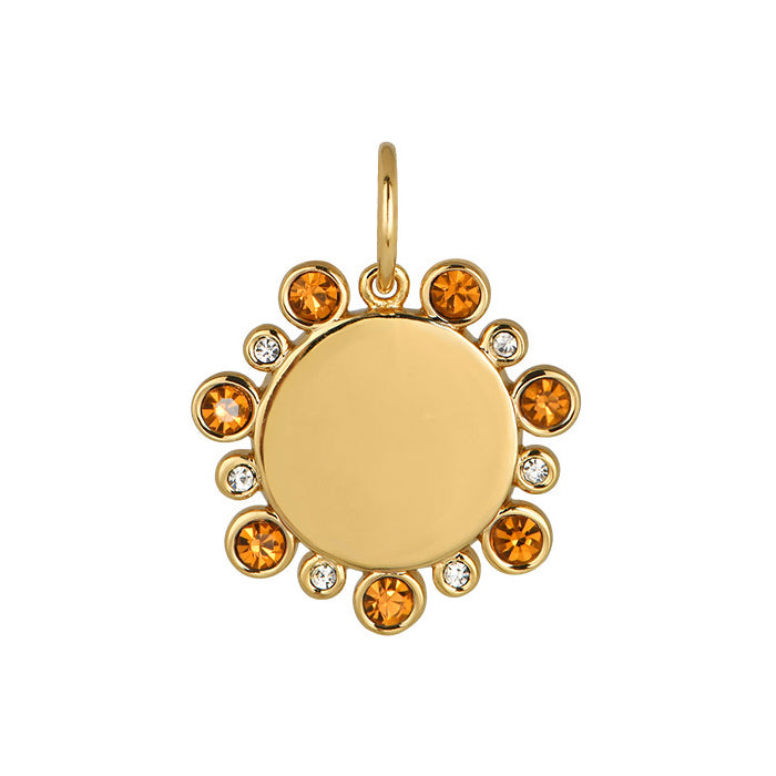 Goldbug Collection’s November Birthstone Pendant features an engravable center surrounded by bezel-set orange and white crystals.