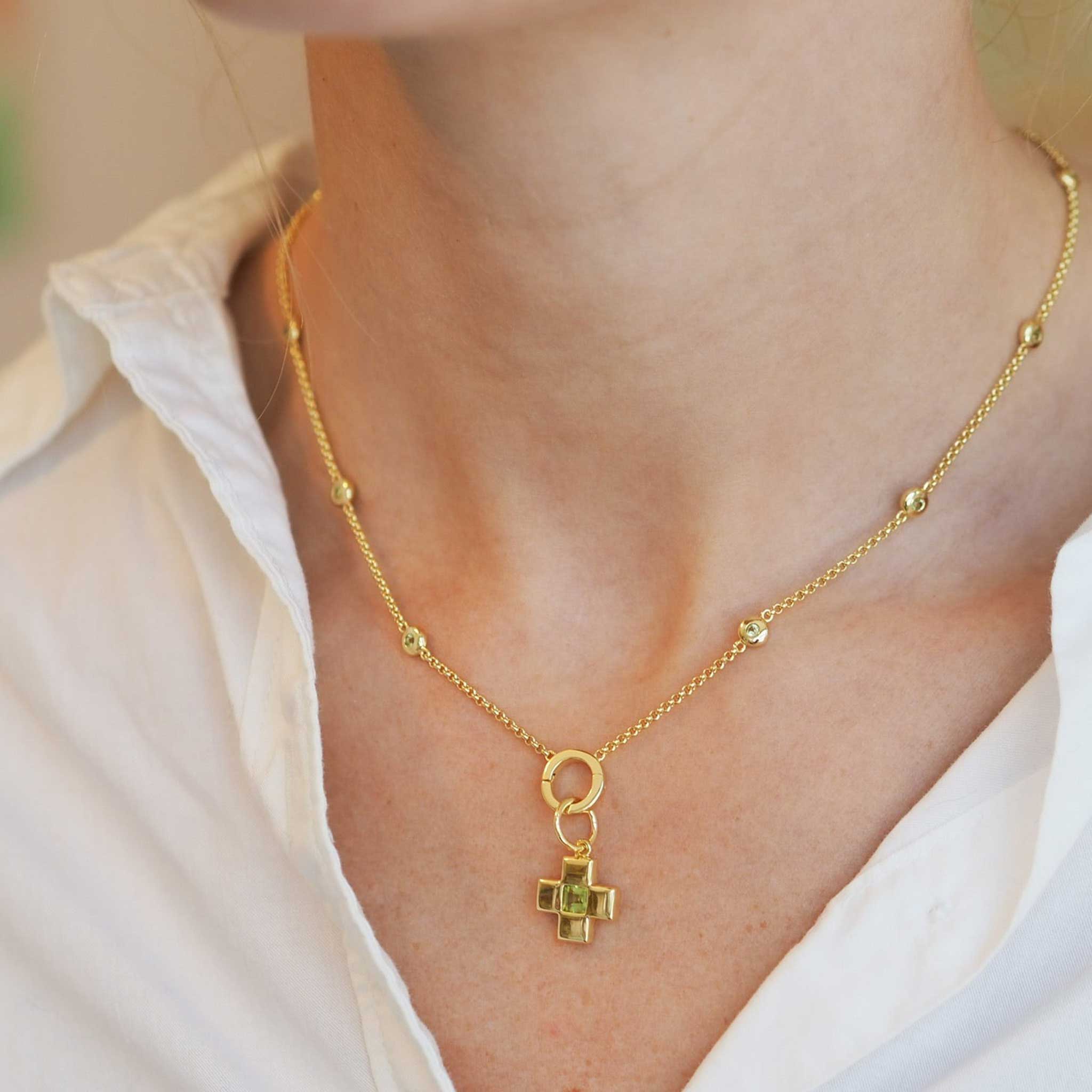 Goldbug Collection’s Peridot Bezel Charm Necklace features a chain with donut bezel set peridot stations and a charm holder clasp that opens and closes to add charms.